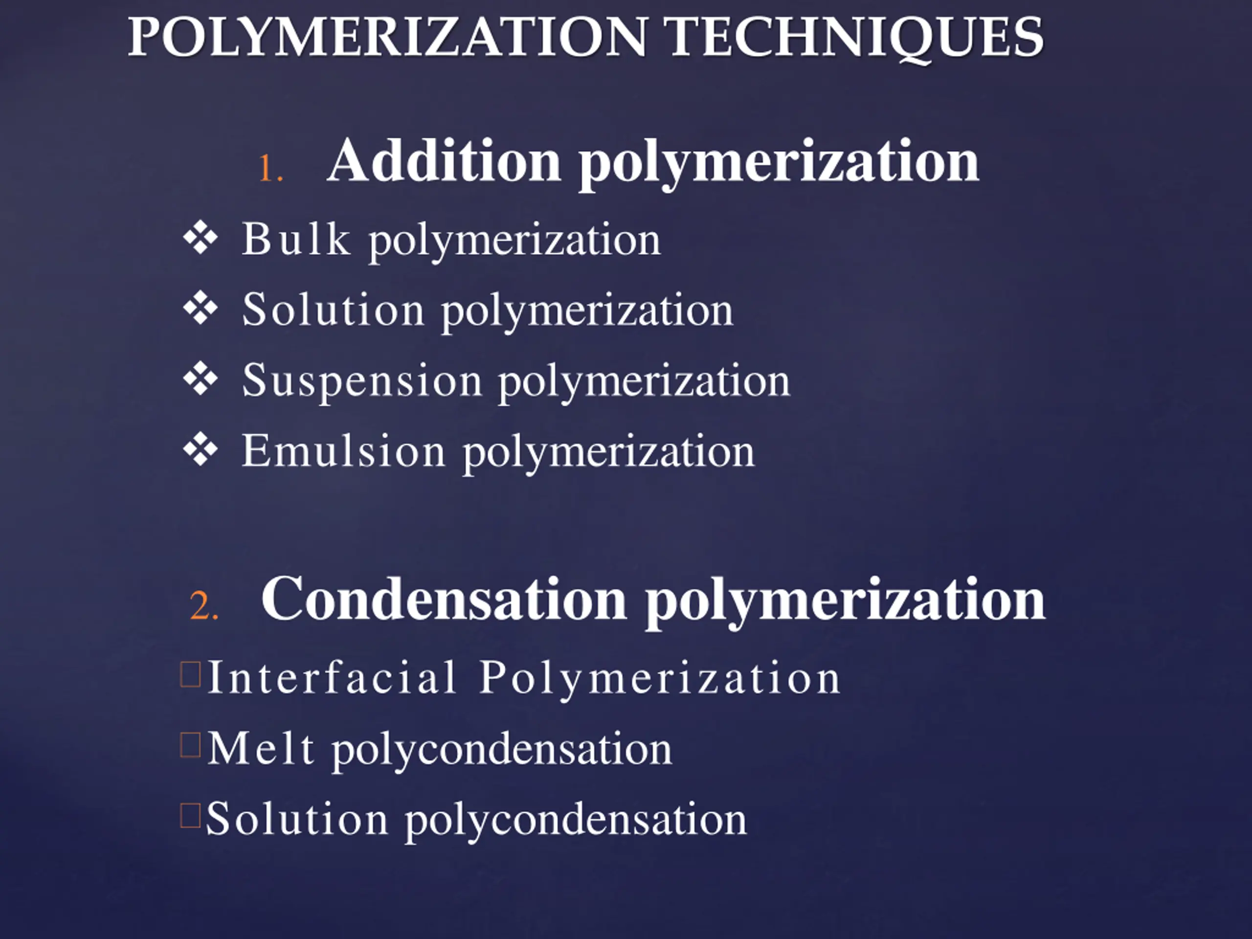POLYMERIZATION TECHNIQUES 1. Addition polymerization Bulk polymerization Solution polymerization Suspension polymerization Emulsion polymerization 2. Condensation polymerization Interfacial Polymerization Melt polycondensation Solution polycondensation