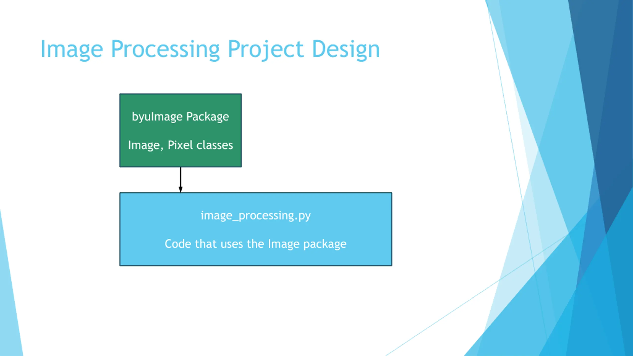 Image Processing Project Design byuImage Package Image, Pixel classes image_processing.py Code that uses the Image package