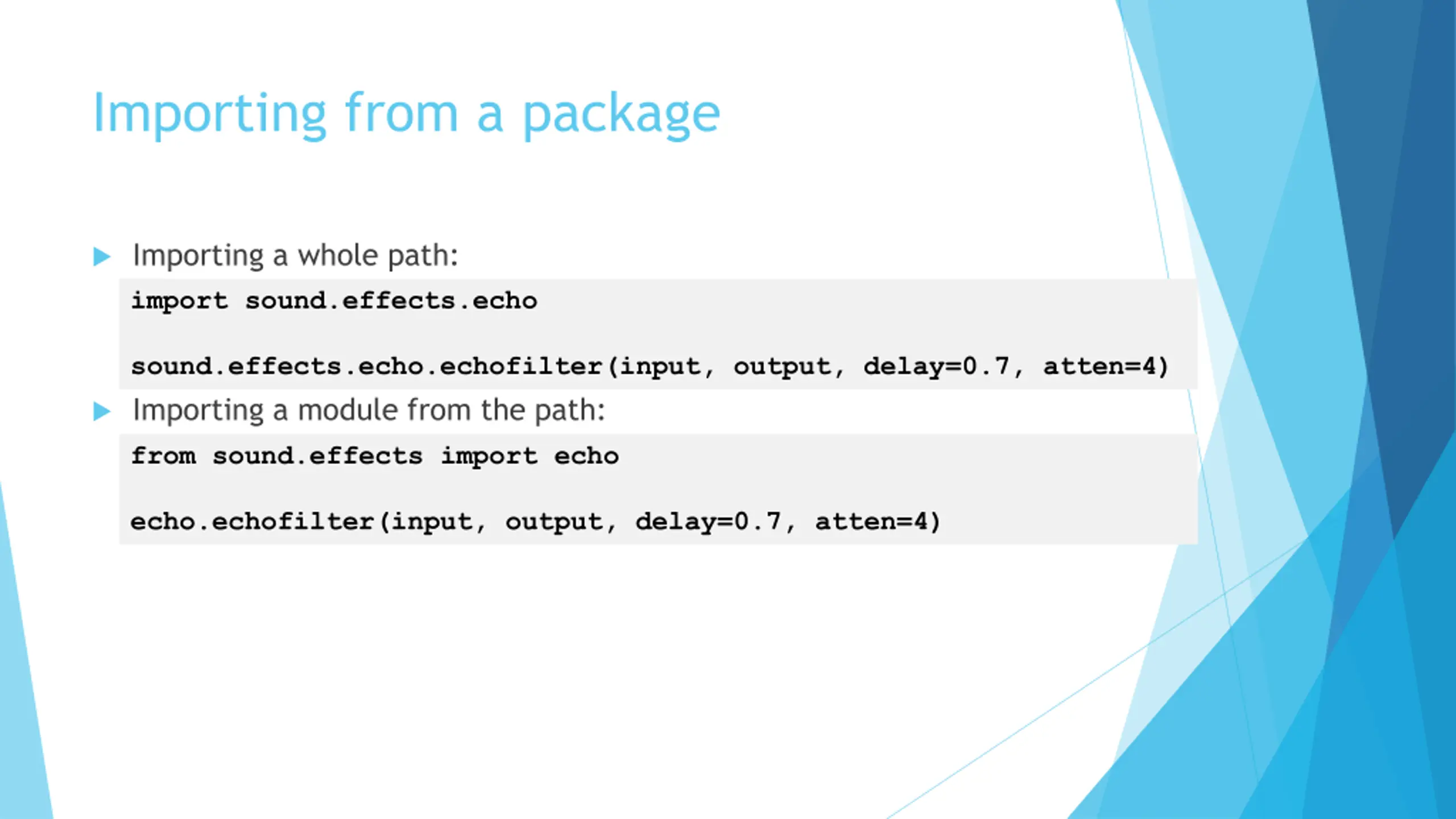 Importing from a package Importing a whole path: import sound.effects.echo sound.effects.echo.echofilter(input, output, delay=0.7, atten=4) Importing a module from the path: from sound.effects import echo echo.echofilter(input, output, delay=0.7, atten=4)