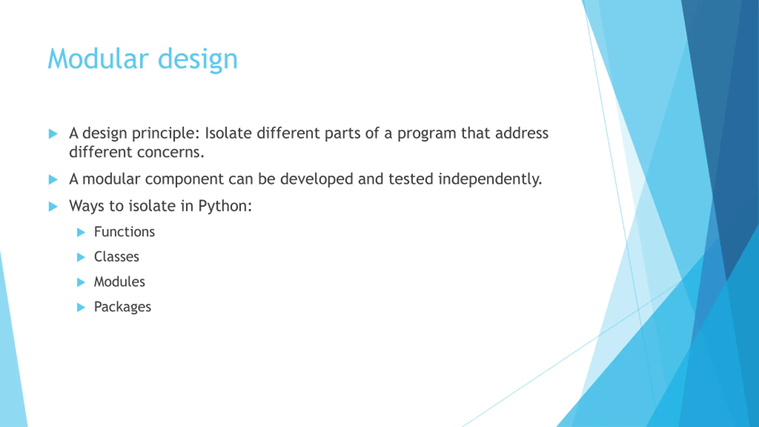 Modular design A design principle: Isolate different parts of a program that address different concerns. A modular component can be developed and tested independently. Ways to isolate in Python: Functions Classes Modules Packages