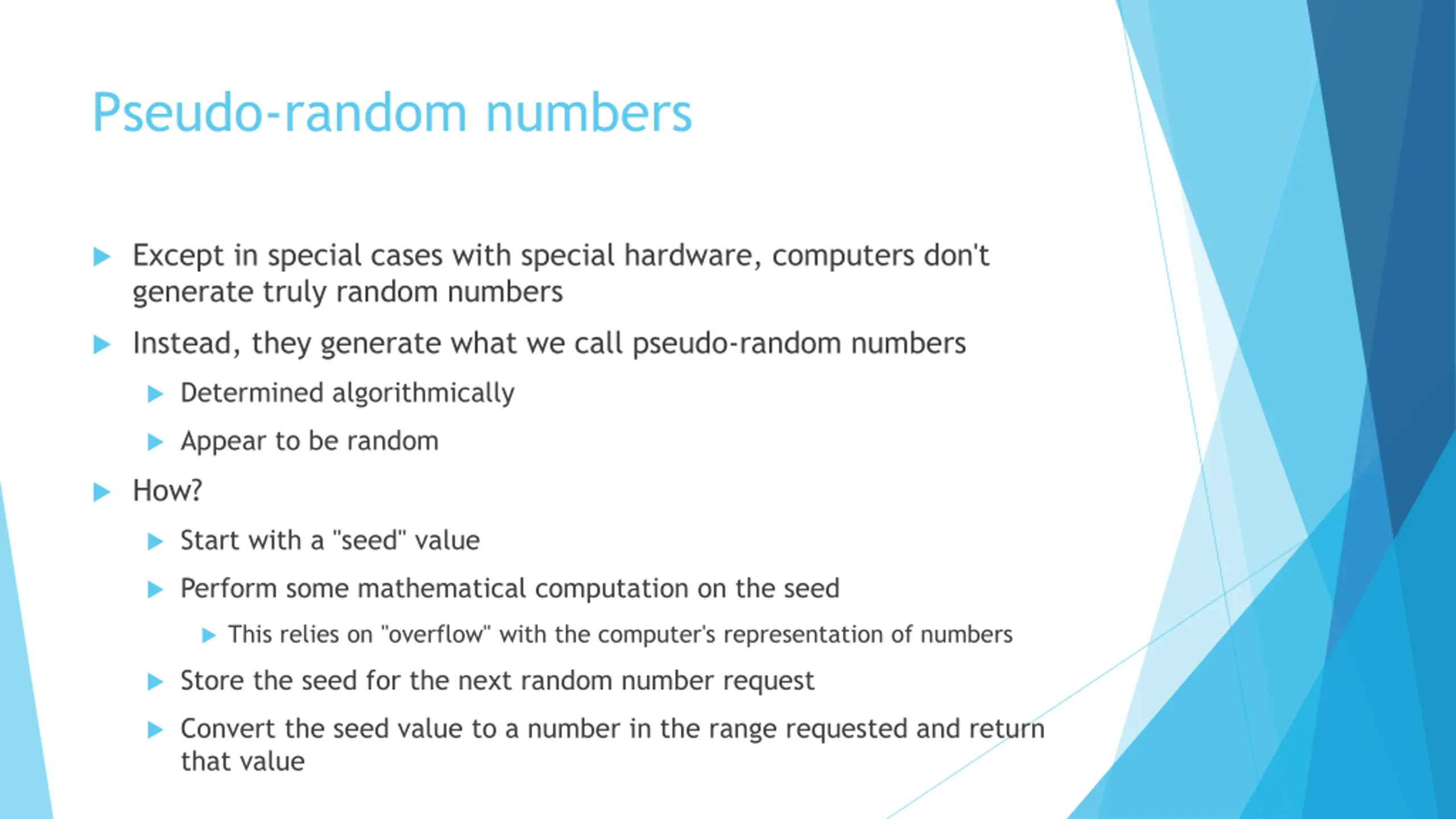 Pseudo-random numbers Except in special cases with special hardware, computers don't generate truly random numbers Instead, they generate what we call pseudo-random numbers Determined algorithmically Appear to be random How? Start with a "seed" value Perform some mathematical computation on the seed This relies on "overflow" with the computer's representation of numbers Store the seed for the next random number request Convert the seed value to a number in the range requested and return that value
