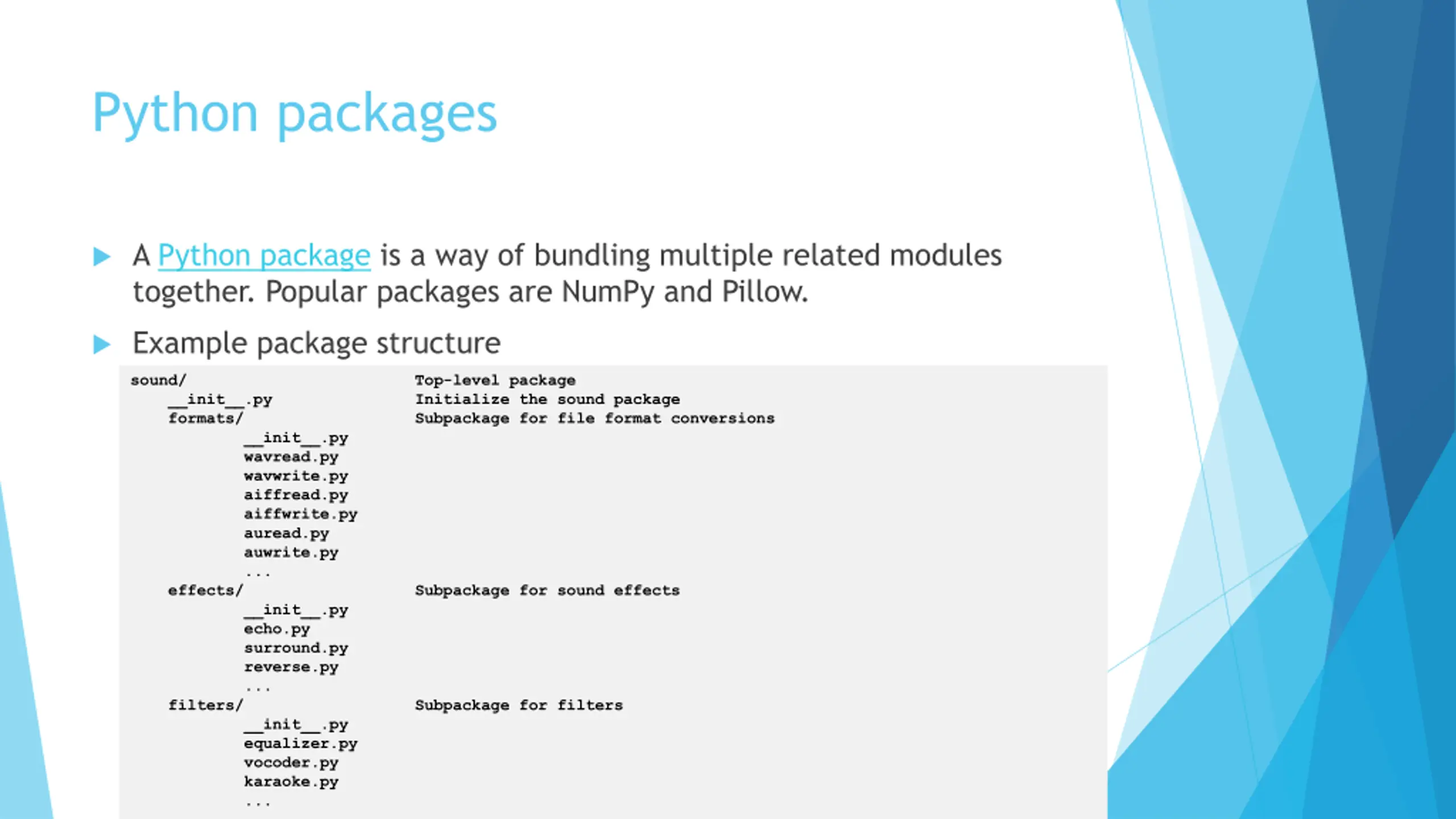 Python packages A Python package is a way of bundling multiple related modules together. Popular packages are NumPy and Pillow. Example package structure sound/ Top-level package __init__.py Initialize the sound package formats/ Subpackage for file format conversions __init__.py wavread.py wavwrite.py aiffread.py aiffwrite.py auread.py auwrite.py ... effects/ Subpackage for sound effects __init__.py echo.py surround.py reverse.py ... filters/ Subpackage for filters __init__.py equalizer.py vocoder.py karaoke.py ...