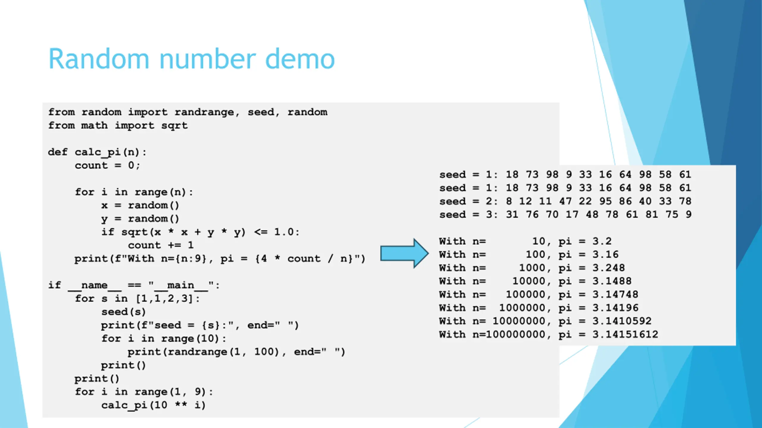 Random number demo from random import randrange, seed, random from math import sqrt def calc_pi(n): count = 0; seed = 1: 18 73 98 9 33 16 64 98 58 61 seed = 1: 18 73 98 9 33 16 64 98 58 61 seed = 2: 8 12 11 47 22 95 86 40 33 78 seed = 3: 31 76 70 17 48 78 61 81 75 9 With n= 10, pi = 3.2 With n= 100, pi = 3.16 With n= 1000, pi = 3.248 With n= 10000, pi = 3.1488 With n= 100000, pi = 3.14748 With n= 1000000, pi = 3.14196 With n= 10000000, pi = 3.1410592 With n=100000000, pi = 3.14151612 for i in range(n): x = random() y = random() if sqrt(x * x + y * y) <= 1.0: count += 1 print(f"With n={n:9}, pi = {4 * count / n}") if __name__ == "__main__": for s in [1,1,2,3]: seed(s) print(f"seed = {s}:", end=" ") for i in range(10): print(randrange(1, 100), end=" ") print() print() for i in range(1, 9): calc_pi(10 ** i)