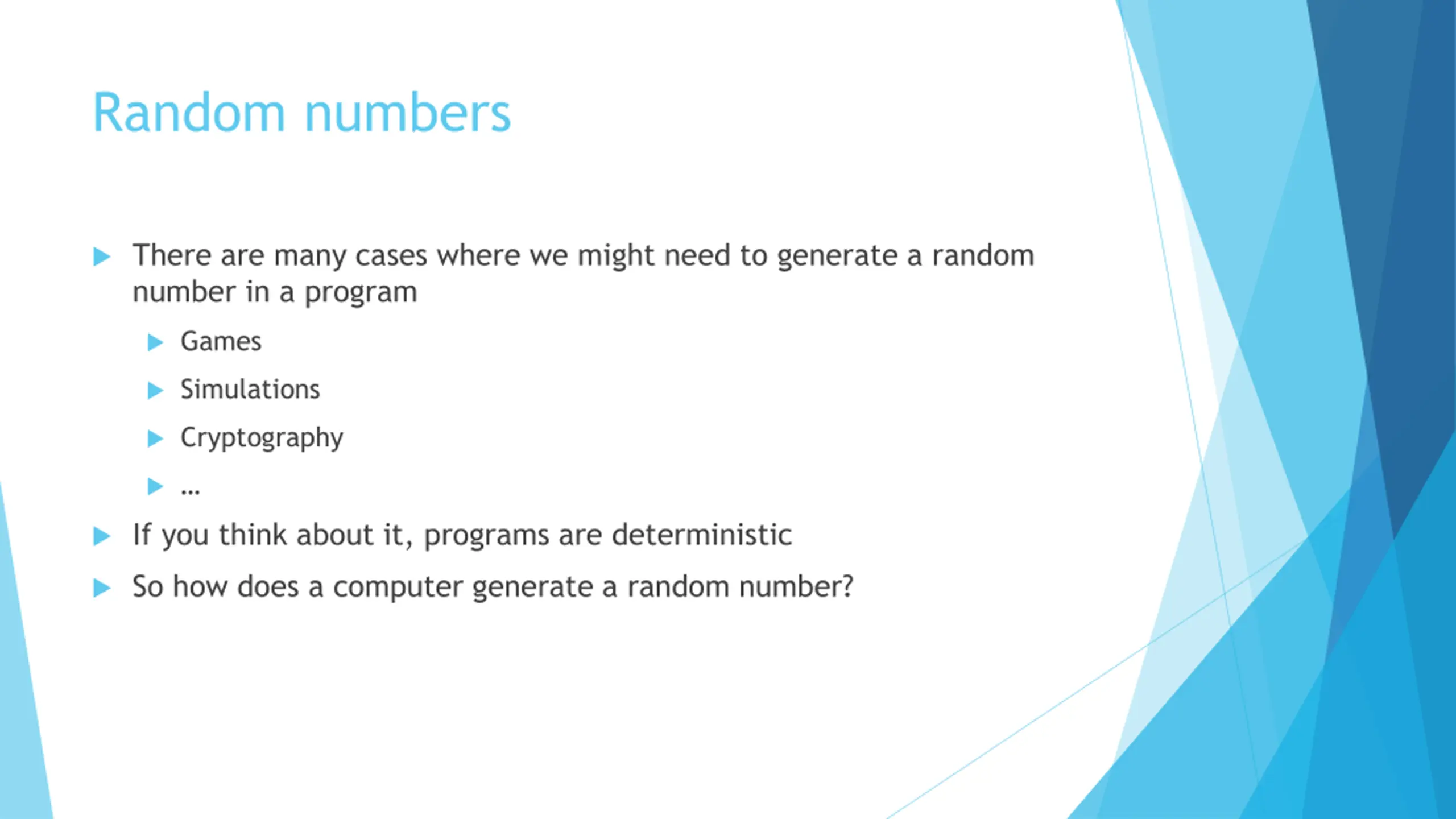 Random numbers There are many cases where we might need to generate a random number in a program Games Simulations Cryptography If you think about it, programs are deterministic So how does a computer generate a random number?