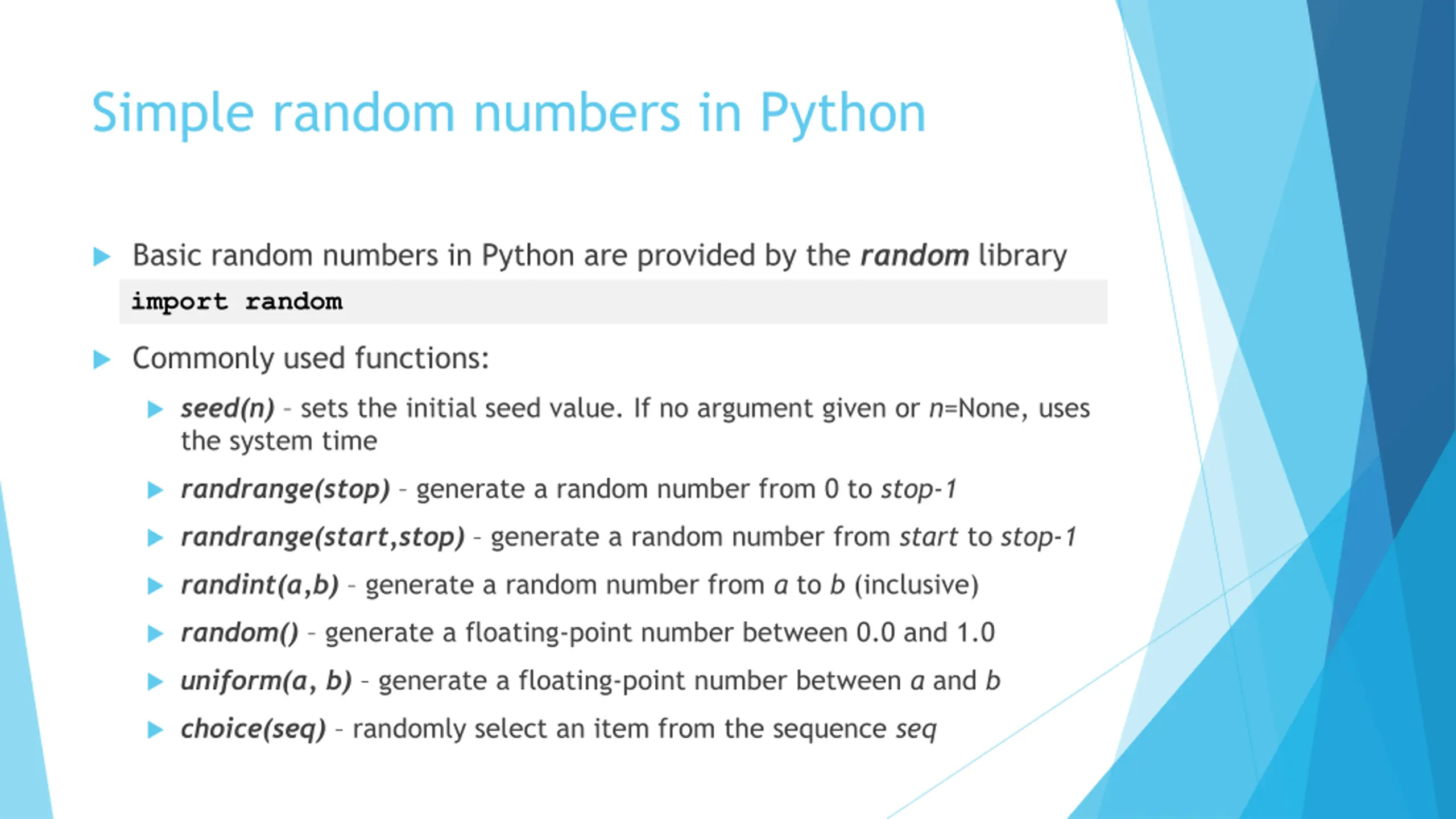 Simple random numbers in Python Basic random numbers in Python are provided by the random library import random Commonly used functions: seed(n) sets the initial seed value. If no argument given or n=None, uses the system time randrange(stop) generate a random number from 0 to stop-1 randrange(start,stop) generate a random number from start to stop-1 randint(a,b) generate a random number from a to b (inclusive) random() generate a floating-point number between 0.0 and 1.0 uniform(a, b) generate a floating-point number between a and b choice(seq) randomly select an item from the sequence seq