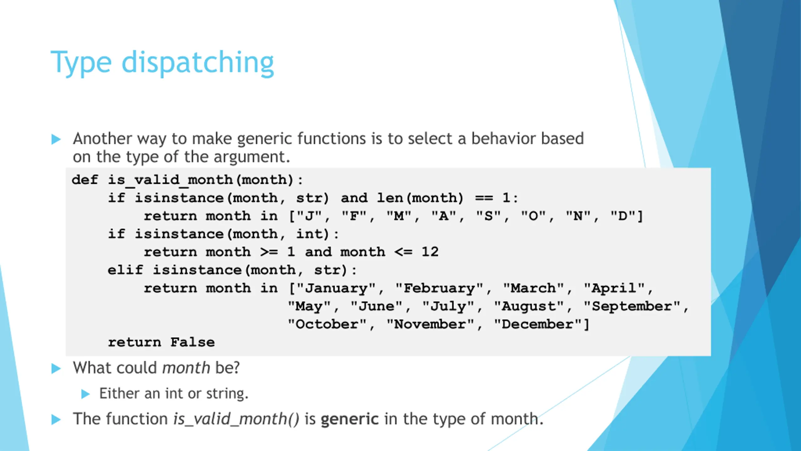 Type dispatching Another way to make generic functions is to select a behavior based on the type of the argument. def is_valid_month(month): if isinstance(month, str) and len(month) == 1: return month in ["J", "F", "M", "A", "S", "O", "N", "D"] if isinstance(month, int): return month >= 1 and month <= 12 elif isinstance(month, str): return month in ["January", "February", "March", "April", "May", "June", "July", "August", "September", "October", "November", "December"] return False What could month be? Either an int or string. The function is_valid_month() is generic in the type of month.