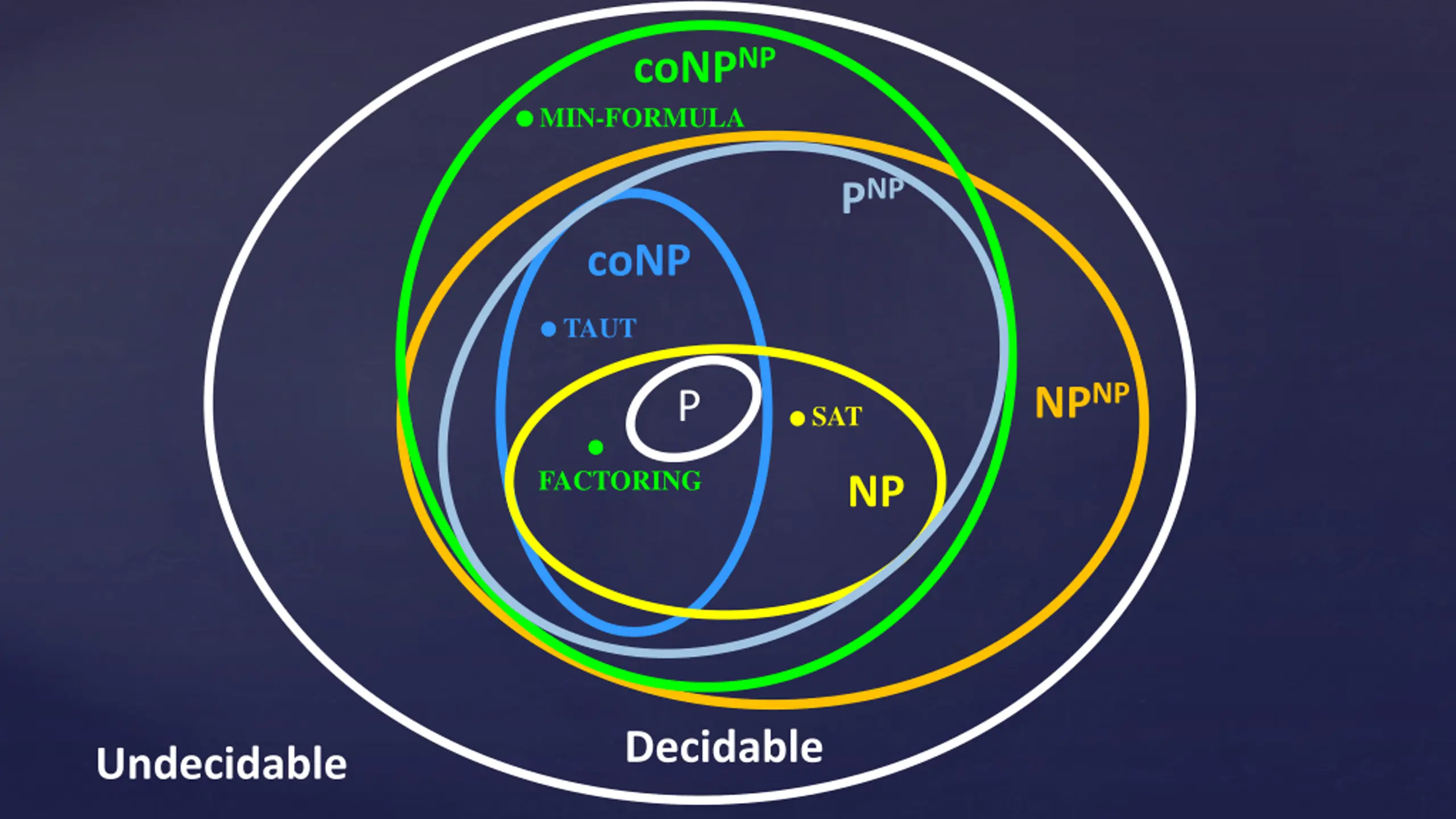 coNPNP MIN-FORMULA PNP coNP TAUT NPNP P SAT FACTORING NP Decidable Undecidable