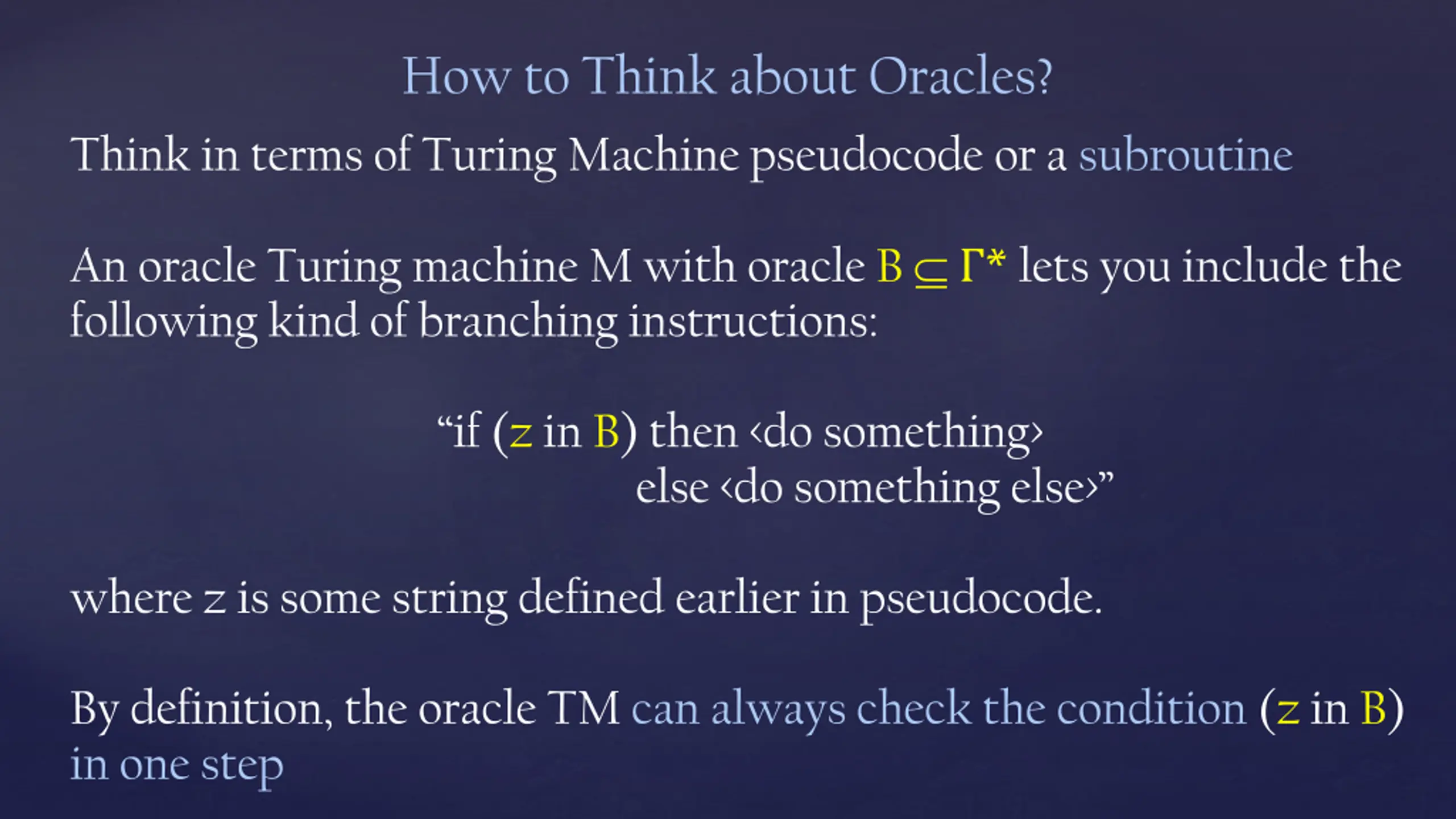 How to Think about Oracles? Think in terms of Turing Machine pseudocode or a subroutine An oracle Turing machine M with oracle B * lets you include the following kind of branching instructions: if (z in B) then <do something> else <do something else> where z is some string defined earlier in pseudocode. By definition, the oracle TM can always check the condition (z in B) in one step