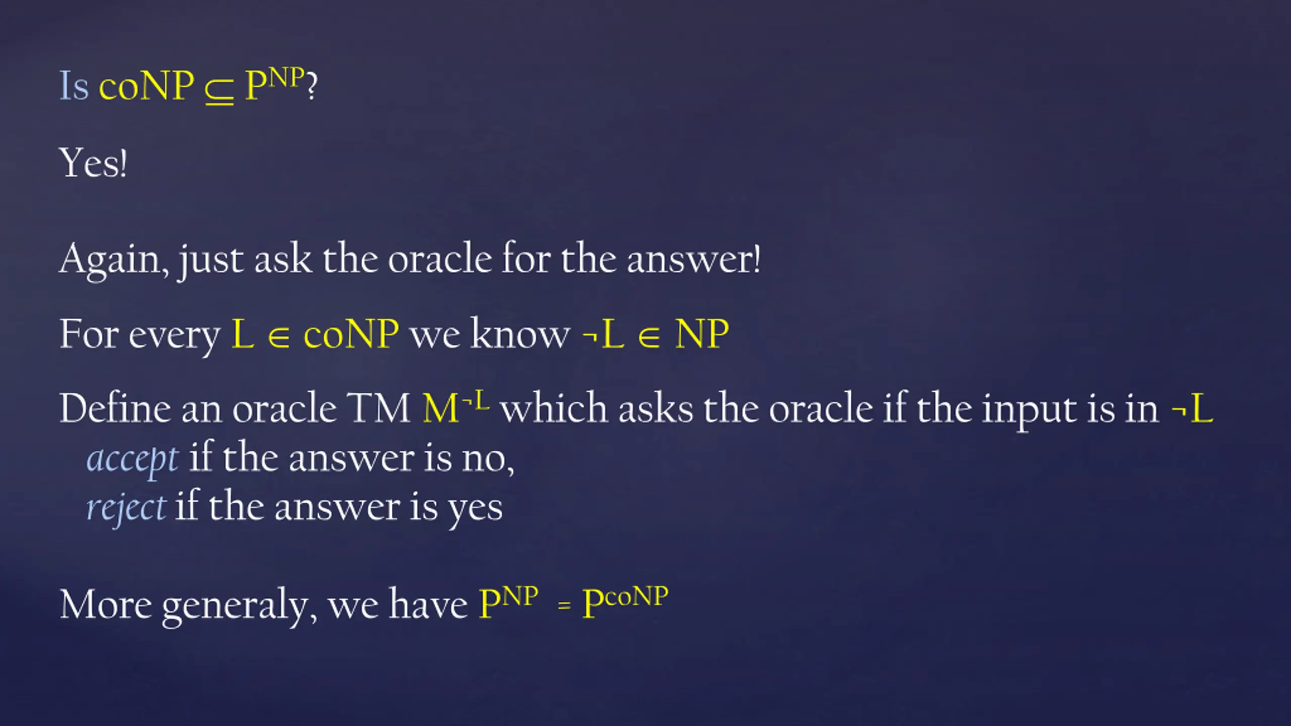 Is coNP PNP? Yes! Again, just ask the oracle for the answer! For every L coNP we know L NP Define an oracle TM M L which asks the oracle if the input is in L accept if the answer is no, reject if the answer is yes More generaly, we have PNP = PcoNP
