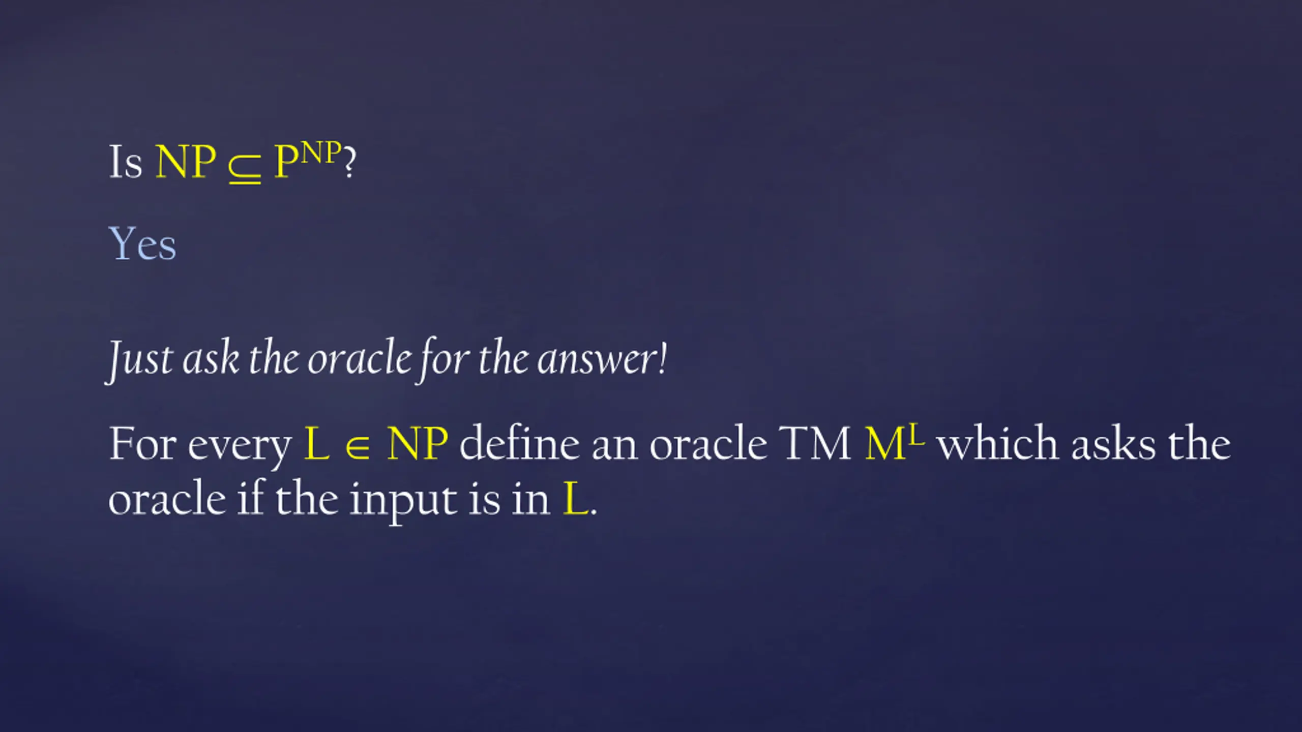 Is NP PNP? Yes Just ask the oracle for the answer! For every L NP define an oracle TM ML which asks the oracle if the input is in L.