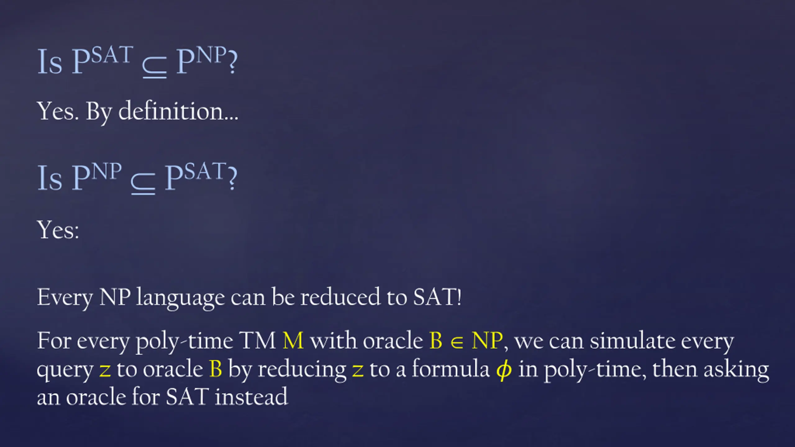 Is PSAT PNP? Yes. By definition Is PNP PSAT? Yes: Every NP language can be reduced to SAT! For every poly-time TM M with oracle B NP, we can simulate every query z to oracle B by reducing z to a formula ? in poly-time, then asking an oracle for SAT instead