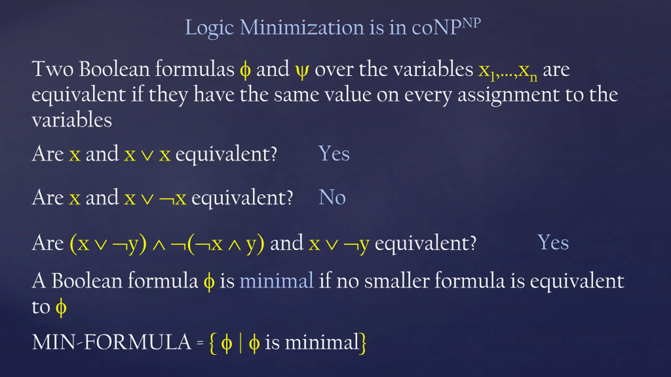 Logic Minimization is in coNPNP Two Boolean formulas and over the variables x1, ,xn are equivalent if they have the same value on every assignment to the variables Are x and x x equivalent? Yes Are x and x x equivalent? No Are (x y) ( x y) and x y equivalent? A Boolean formula is minimal if no smaller formula is equivalent to MIN-FORMULA = { | is minimal} Yes