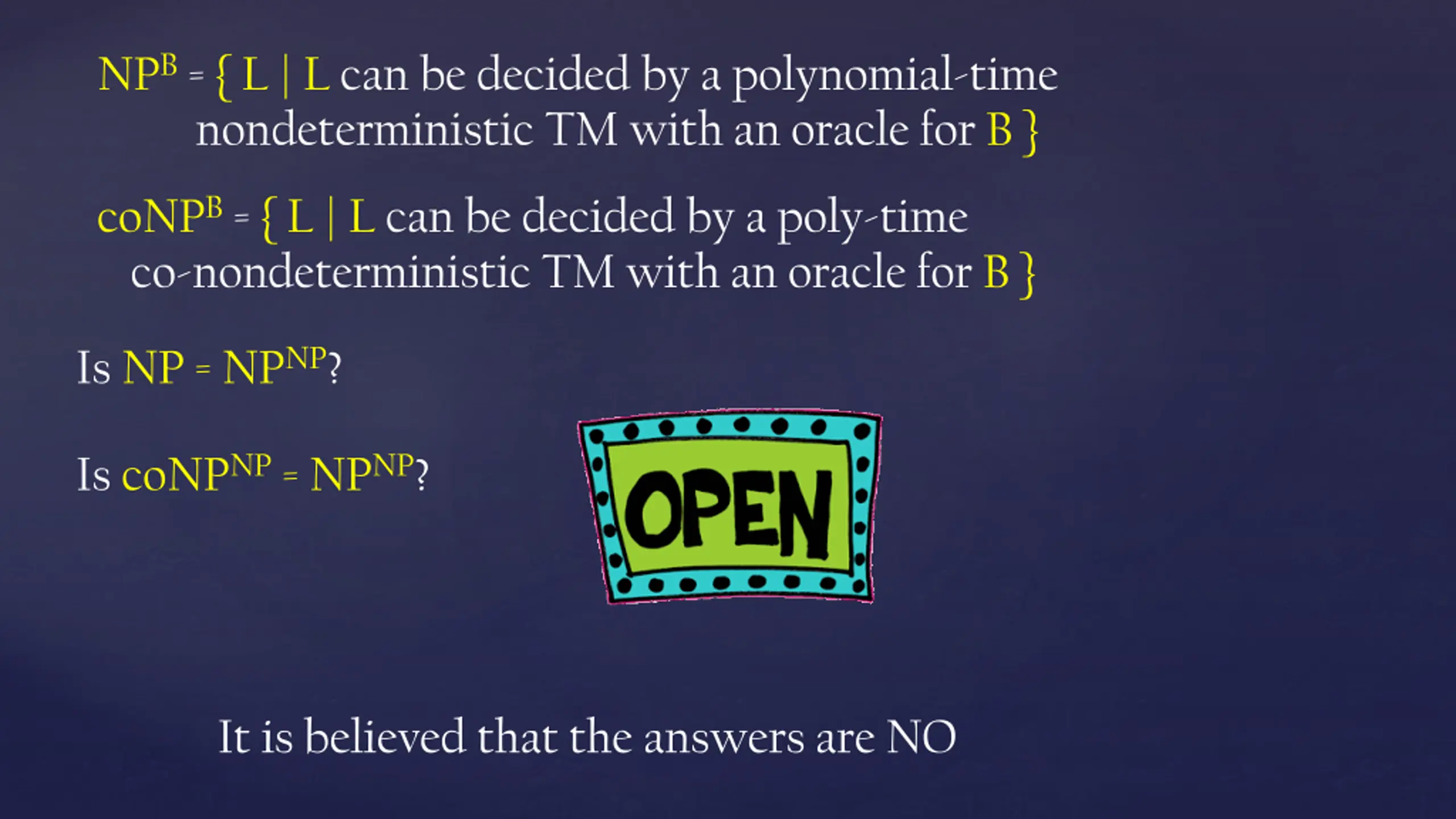 NPB = { L | L can be decided by a polynomial-time nondeterministic TM with an oracle for B } coNPB = { L | L can be decided by a poly-time co-nondeterministic TM with an oracle for B } Is NP = NPNP? Is coNPNP = NPNP? It is believed that the answers are NO