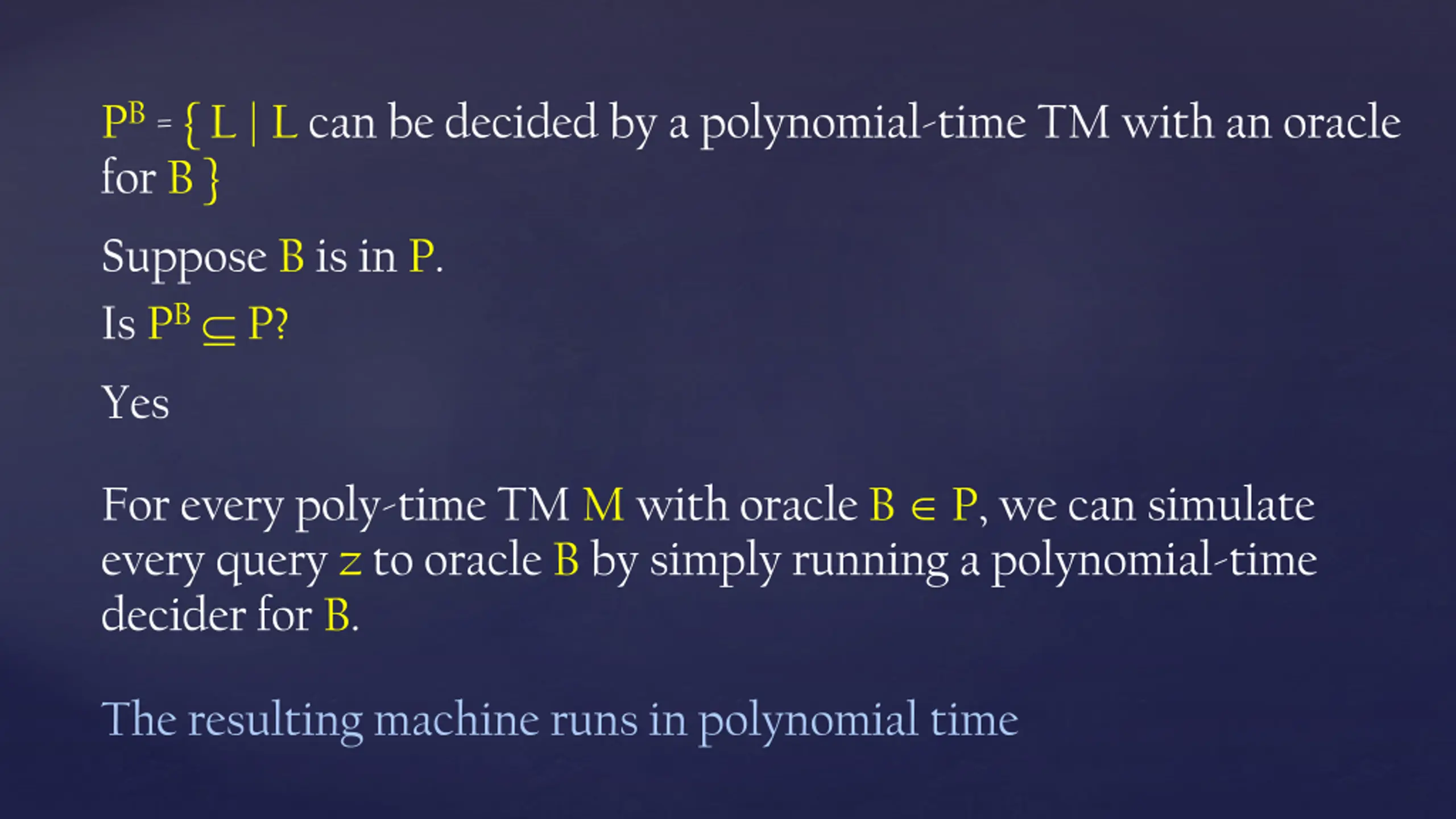PB = { L | L can be decided by a polynomial-time TM with an oracle for B } Suppose B is in P. Is PB P? Yes For every poly-time TM M with oracle B P, we can simulate every query z to oracle B by simply running a polynomial-time decider for B. The resulting machine runs in polynomial time