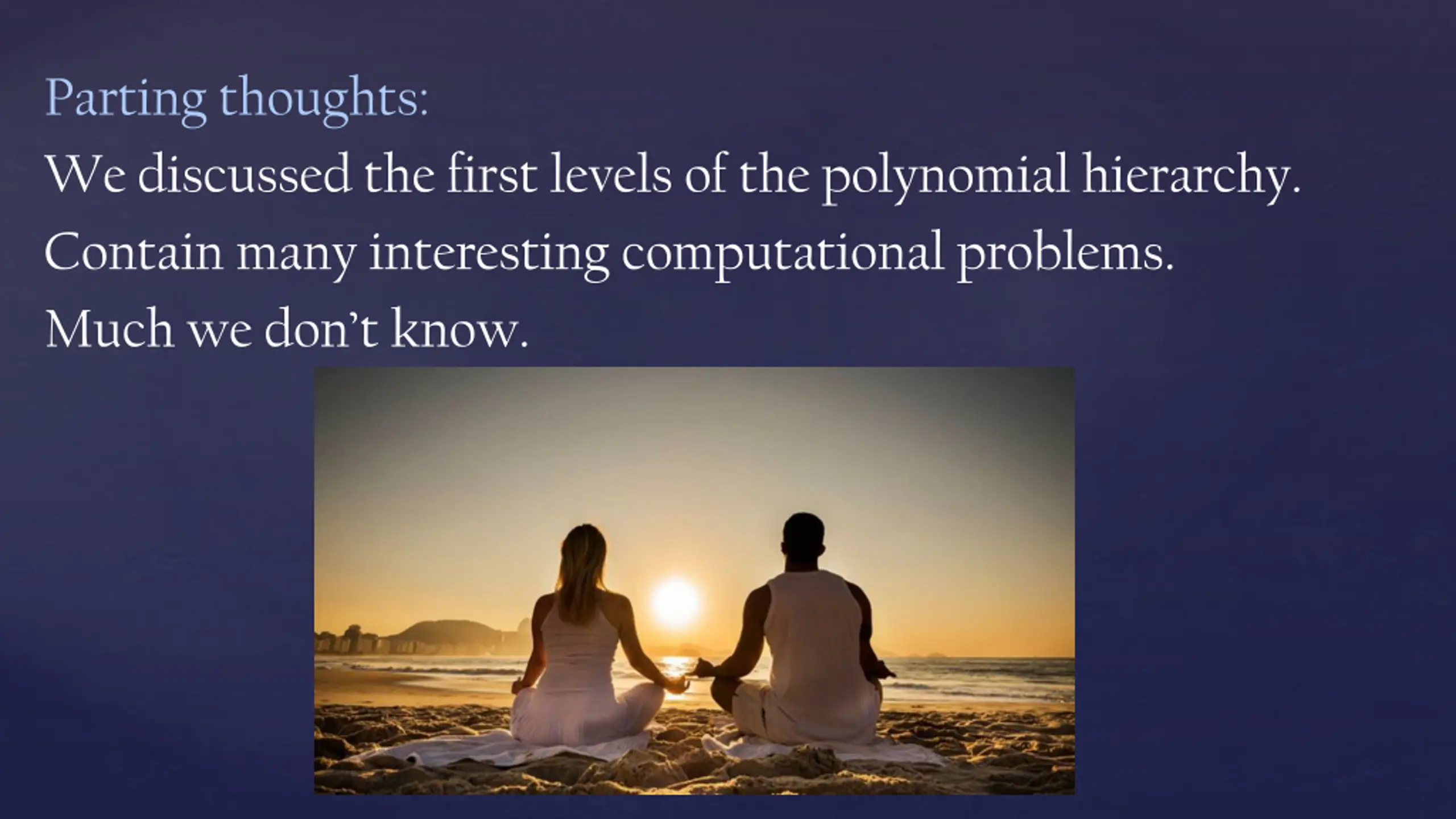 Parting thoughts: We discussed the first levels of the polynomial hierarchy. Contain many interesting computational problems. Much we don t know.