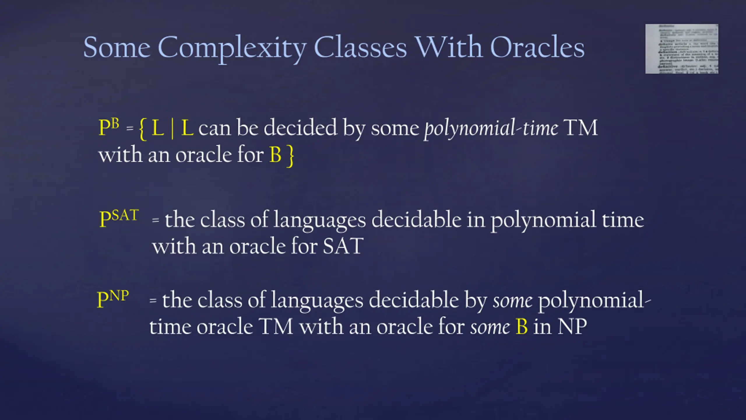 Some Complexity Classes With Oracles PB = { L | L can be decided by some polynomial-time TM with an oracle for B } PSAT= the class of languages decidable in polynomial time with an oracle for SAT = the class of languages decidable by some polynomial- time oracle TM with an oracle for some B in NP PNP