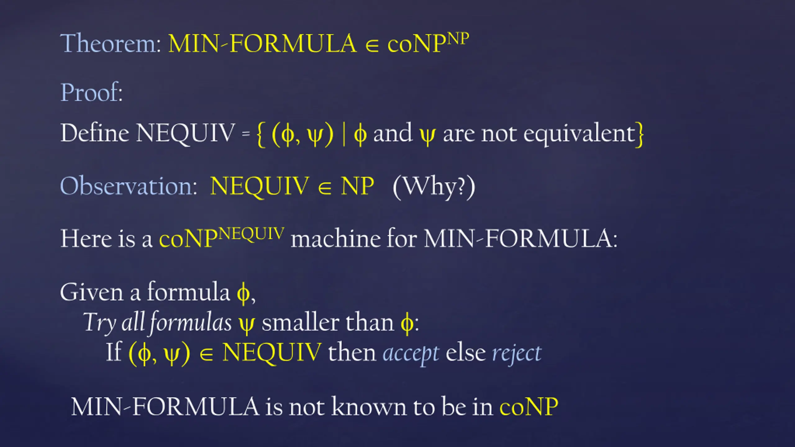Theorem: MIN-FORMULA coNPNP Proof: Define NEQUIV = { ( , ) | and are not equivalent} Observation: NEQUIV NP (Why?) Here is a coNPNEQUIV machine for MIN-FORMULA: Given a formula , Try all formulas smaller than : If ( , ) NEQUIV then accept else reject MIN-FORMULA is not known to be in coNP