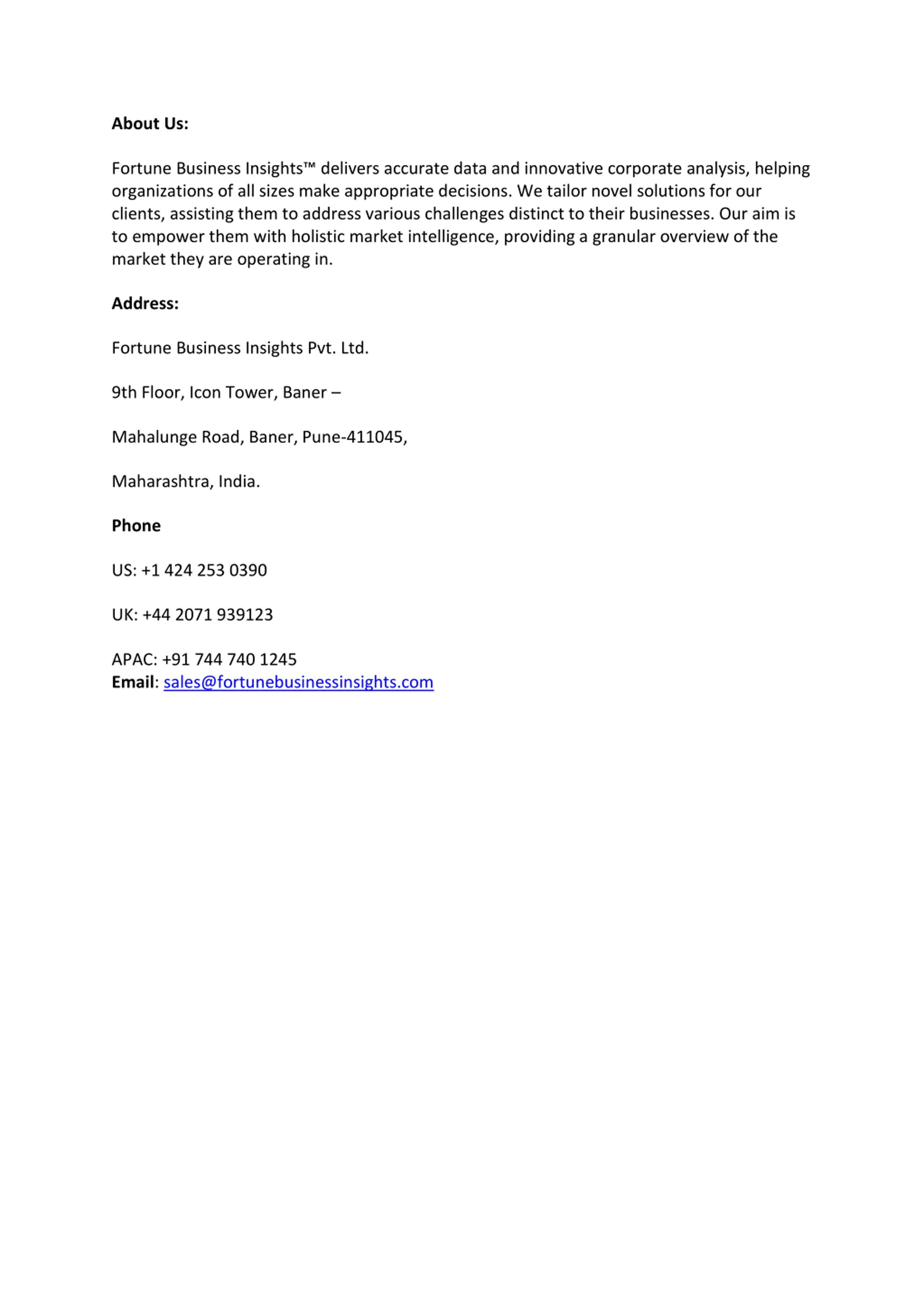 About Us: Fortune Business Insights delivers accurate data and innovative corporate analysis, helping organizations of all sizes make appropriate decisions. We tailor novel solutions for our clients, assisting them to address various challenges distinct to their businesses. Our aim is to empower them with holistic market intelligence, providing a granular overview of the market they are operating in. Address: Fortune Business Insights Pvt. Ltd. 9th Floor, Icon Tower, Baner Mahalunge Road, Baner, Pune-411045, Maharashtra, India. Phone US: +1 424 253 0390 UK: +44 2071 939123 APAC: +91 744 740 1245 Email: sales@fortunebusinessinsights.com