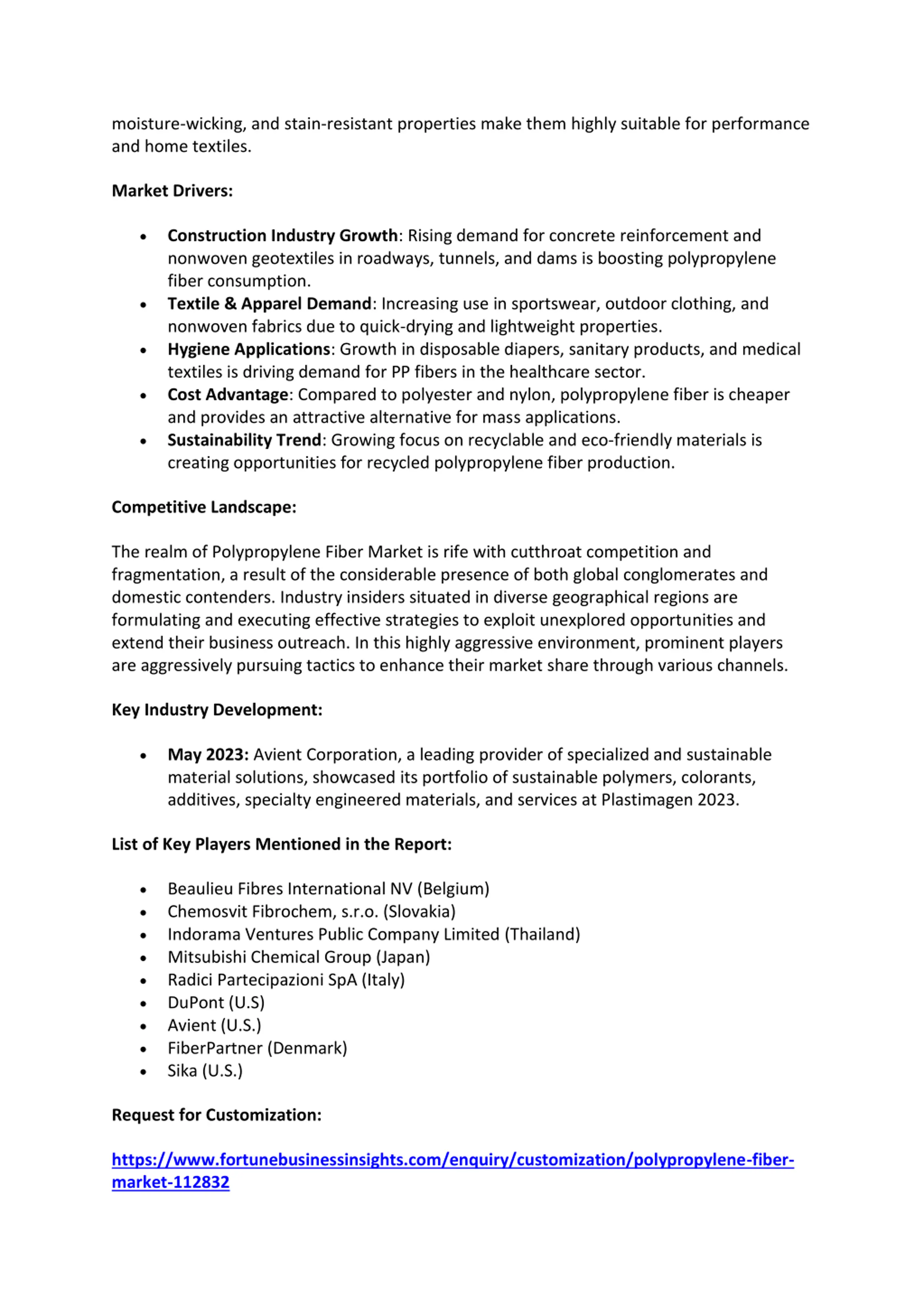 moisture-wicking, and stain-resistant properties make them highly suitable for performance and home textiles. Market Drivers: Construction Industry Growth: Rising demand for concrete reinforcement and nonwoven geotextiles in roadways, tunnels, and dams is boosting polypropylene fiber consumption. Textile & Apparel Demand: Increasing use in sportswear, outdoor clothing, and nonwoven fabrics due to quick-drying and lightweight properties. Hygiene Applications: Growth in disposable diapers, sanitary products, and medical textiles is driving demand for PP fibers in the healthcare sector. Cost Advantage: Compared to polyester and nylon, polypropylene fiber is cheaper and provides an attractive alternative for mass applications. Sustainability Trend: Growing focus on recyclable and eco-friendly materials is creating opportunities for recycled polypropylene fiber production. Competitive Landscape: The realm of Polypropylene Fiber Market is rife with cutthroat competition and fragmentation, a result of the considerable presence of both global conglomerates and domestic contenders. Industry insiders situated in diverse geographical regions are formulating and executing effective strategies to exploit unexplored opportunities and extend their business outreach. In this highly aggressive environment, prominent players are aggressively pursuing tactics to enhance their market share through various channels. Key Industry Development: May 2023: Avient Corporation, a leading provider of specialized and sustainable material solutions, showcased its portfolio of sustainable polymers, colorants, additives, specialty engineered materials, and services at Plastimagen 2023. List of Key Players Mentioned in the Report: Beaulieu Fibres International NV (Belgium) Chemosvit Fibrochem, s.r.o. (Slovakia) Indorama Ventures Public Company Limited (Thailand) Mitsubishi Chemical Group (Japan) Radici Partecipazioni SpA (Italy) DuPont (U.S) Avient (U.S.) FiberPartner (Denmark) Sika (U.S.) Request for Customization: https://www.fortunebusinessinsights.com/enquiry/customization/polypropylene-fiber- market-112832