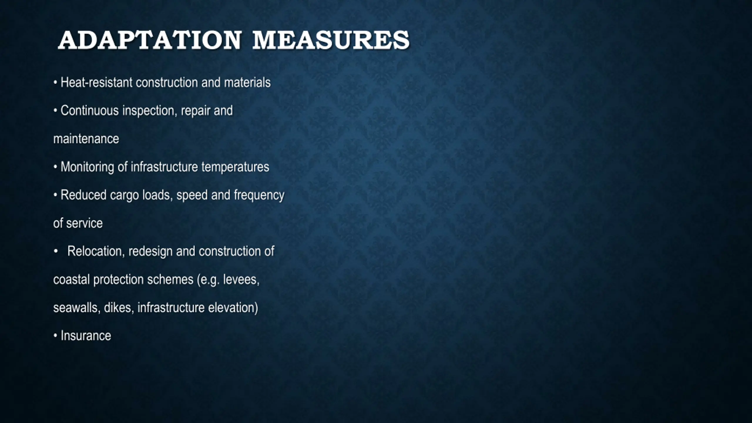 ADAPTATION MEASURES Heat-resistant construction and materials Continuous inspection, repair and maintenance Monitoring of infrastructure temperatures Reduced cargo loads, speed and frequency of service Relocation, redesign and construction of coastal protection schemes (e.g. levees, seawalls, dikes, infrastructure elevation) Insurance