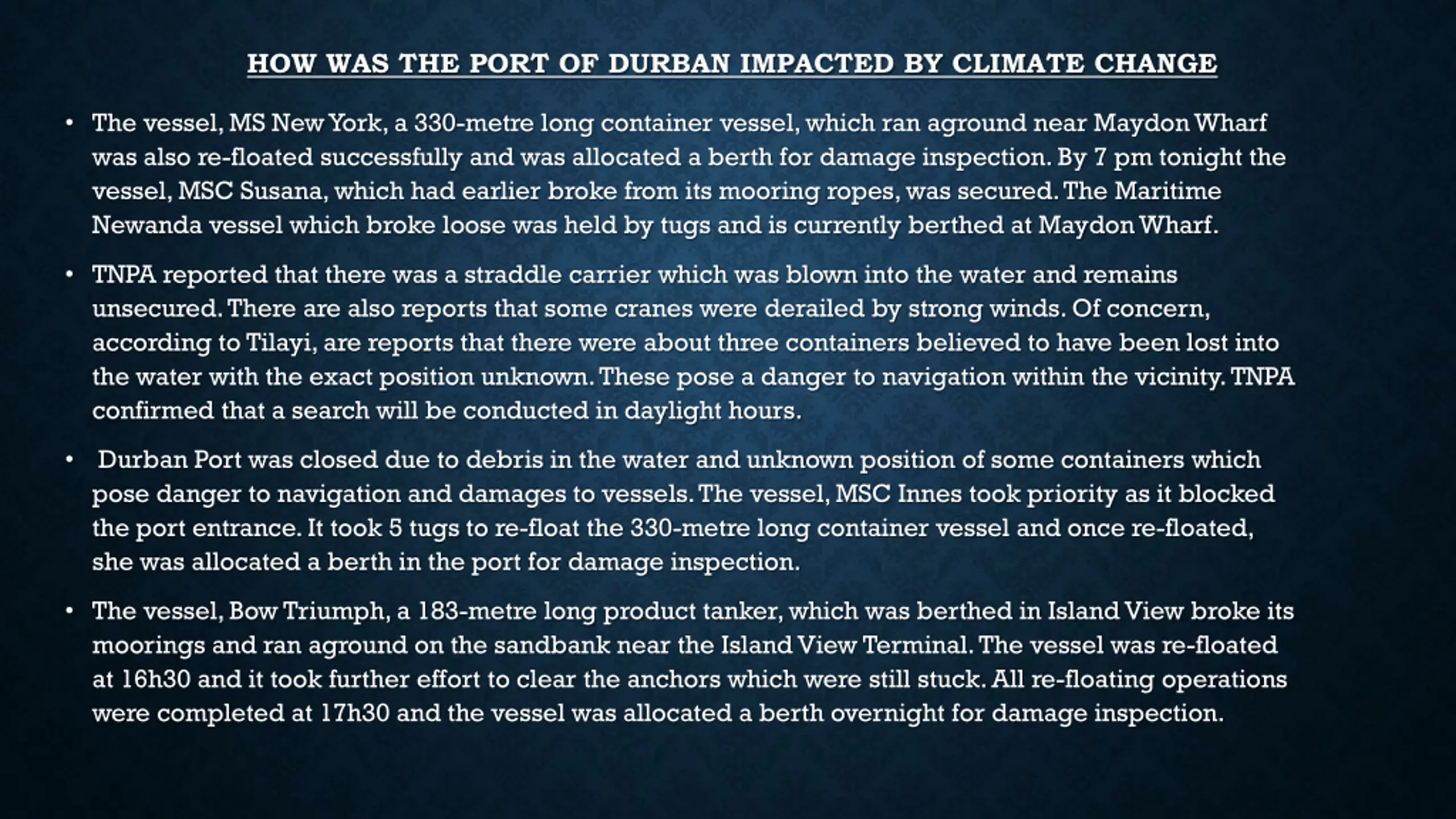 HOW WAS THE PORT OF DURBAN IMPACTED BY CLIMATE CHANGE The vessel, MS New York, a 330-metre long container vessel, which ran aground near Maydon Wharf was also re-floated successfully and was allocated a berth for damage inspection. By 7 pm tonight the vessel, MSC Susana, which had earlier broke from its mooring ropes, was secured. The Maritime Newanda vessel which broke loose was held by tugs and is currently berthed at Maydon Wharf. TNPA reported that there was a straddle carrier which was blown into the water and remains unsecured. There are also reports that some cranes were derailed by strong winds. Of concern, according to Tilayi, are reports that there were about three containers believed to have been lost into the water with the exact position unknown. These pose a danger to navigation within the vicinity. TNPA confirmed that a search will be conducted in daylight hours. Durban Port was closed due to debris in the water and unknown position of some containers which pose danger to navigation and damages to vessels. The vessel, MSC Innes took priority as it blocked the port entrance. It took 5 tugs to re-float the 330-metre long container vessel and once re-floated, she was allocated a berth in the port for damage inspection. The vessel, Bow Triumph, a 183-metre long product tanker, which was berthed in Island View broke its moorings and ran aground on the sandbank near the Island View Terminal. The vessel was re-floated at 16h30 and it took further effort to clear the anchors which were still stuck. All re-floating operations were completed at 17h30 and the vessel was allocated a berth overnight for damage inspection.