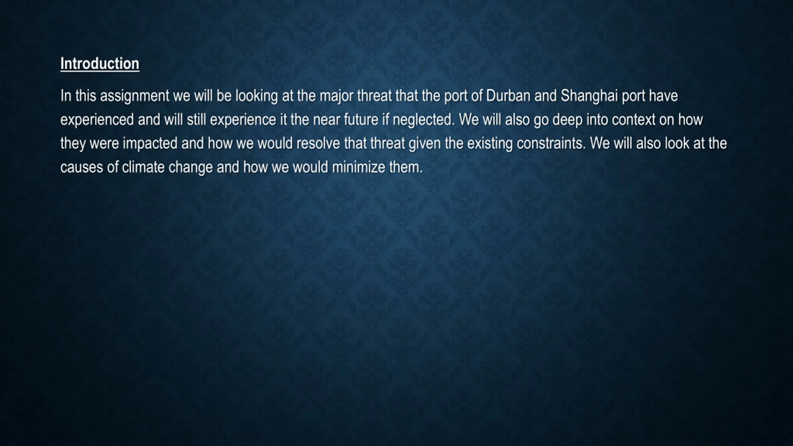 Introduction In this assignment we will be looking at the major threat that the port of Durban and Shanghai port have experienced and will still experience it the near future if neglected. We will also go deep into context on how they were impacted and how we would resolve that threat given the existing constraints. We will also look at the causes of climate change and how we would minimize them.