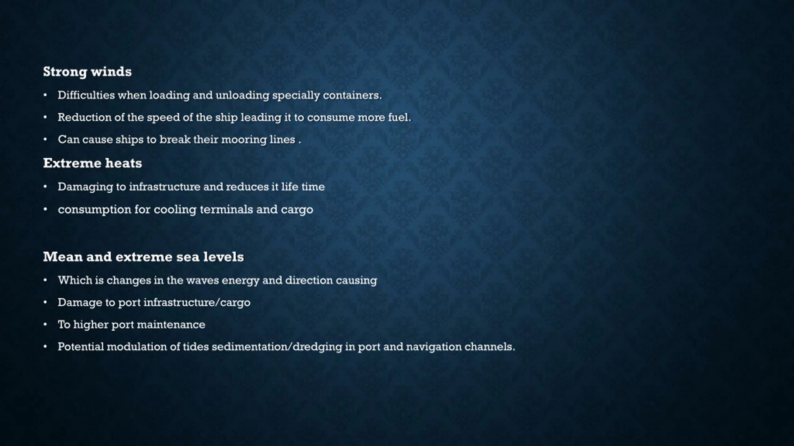 Strong winds Difficulties when loading and unloading specially containers. Reduction of the speed of the ship leading it to consume more fuel. Can cause ships to break their mooring lines . Extreme heats Damaging to infrastructure and reduces it life time consumption for cooling terminals and cargo Mean and extreme sea levels Which is changes in the waves energy and direction causing Damage to port infrastructure/cargo To higher port maintenance Potential modulation of tides sedimentation/dredging in port and navigation channels.