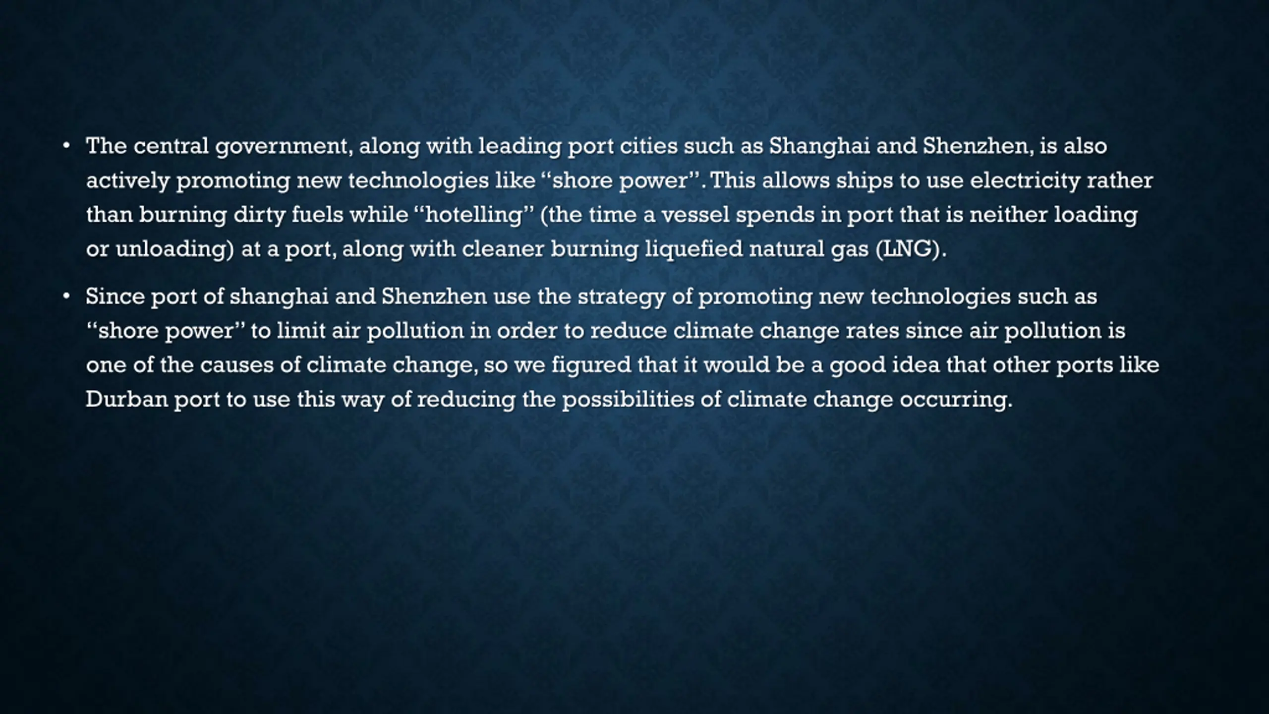 The central government, along with leading port cities such as Shanghai and Shenzhen, is also actively promoting new technologies like shore power . This allows ships to use electricity rather than burning dirty fuels while hotelling (the time a vessel spends in port that is neither loading or unloading) at a port, along with cleaner burning liquefied natural gas (LNG). Since port of shanghai and Shenzhen use the strategy of promoting new technologies such as shore power to limit air pollution in order to reduce climate change rates since air pollution is one of the causes of climate change, so we figured that it would be a good idea that other ports like Durban port to use this way of reducing the possibilities of climate change occurring.