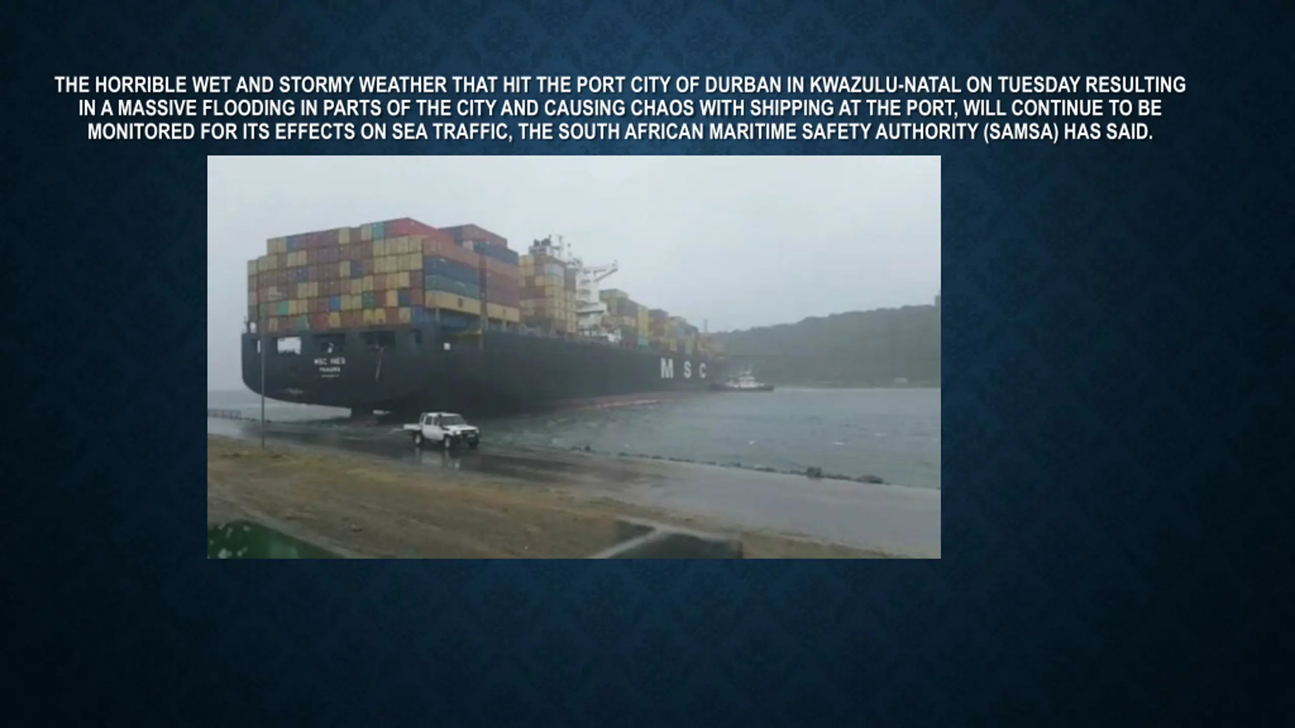 THE HORRIBLE WET AND STORMY WEATHER THAT HIT THE PORT CITY OF DURBAN IN KWAZULU-NATAL ON TUESDAY RESULTING IN A MASSIVE FLOODING IN PARTS OF THE CITY AND CAUSING CHAOS WITH SHIPPING AT THE PORT, WILL CONTINUE TO BE MONITORED FOR ITS EFFECTS ON SEA TRAFFIC, THE SOUTH AFRICAN MARITIME SAFETY AUTHORITY (SAMSA) HAS SAID.