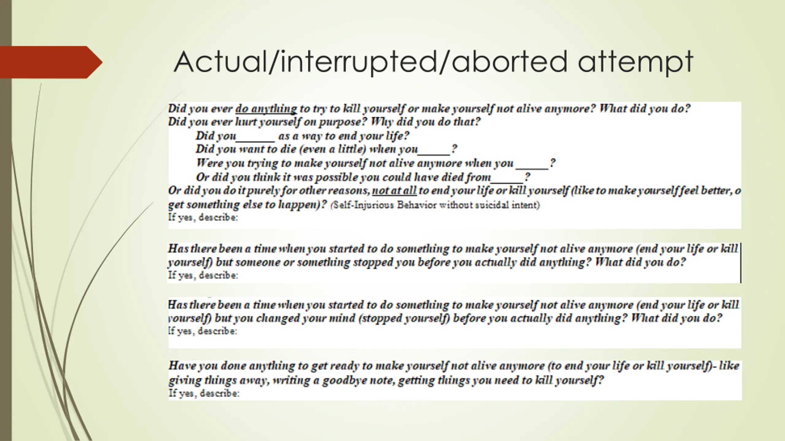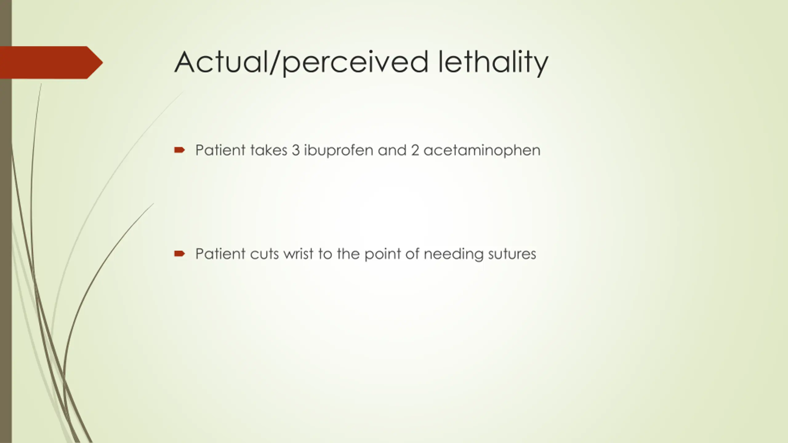 Actual/perceived lethality Patient takes 3 ibuprofen and 2 acetaminophen Patient cuts wrist to the point of needing sutures