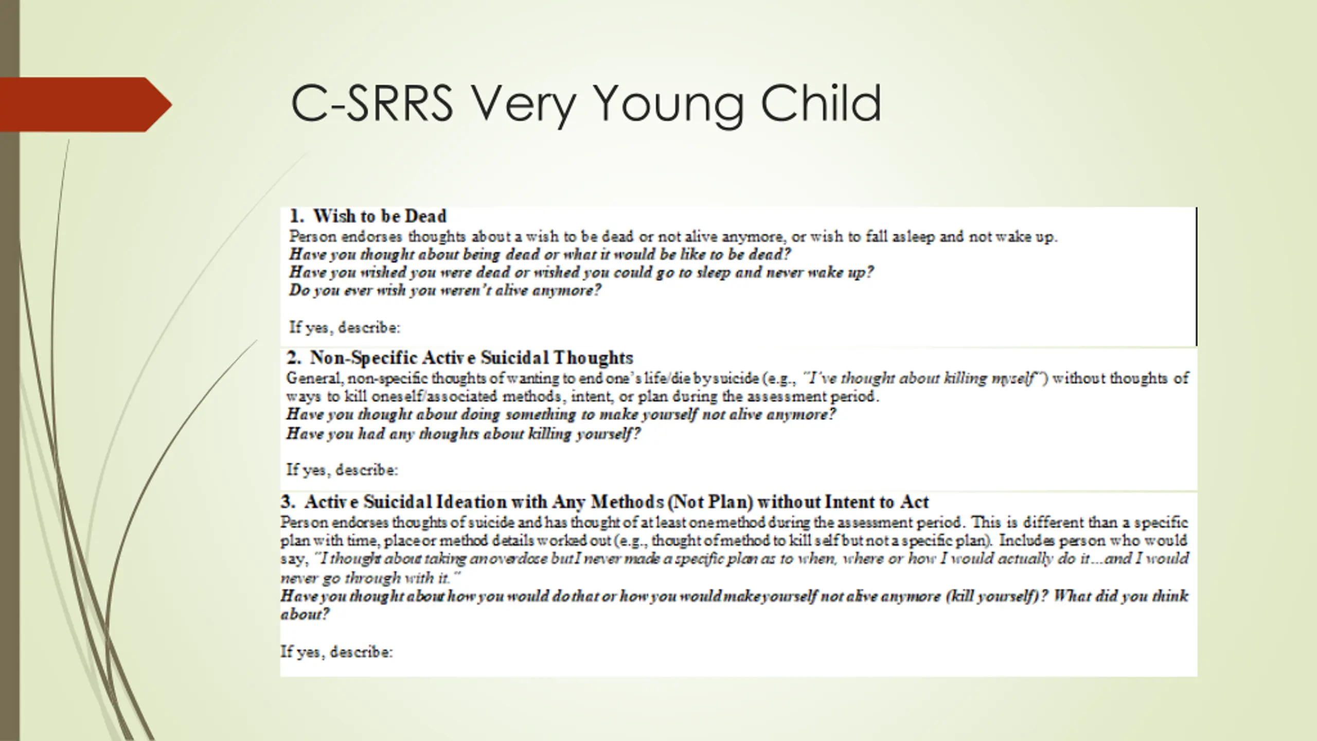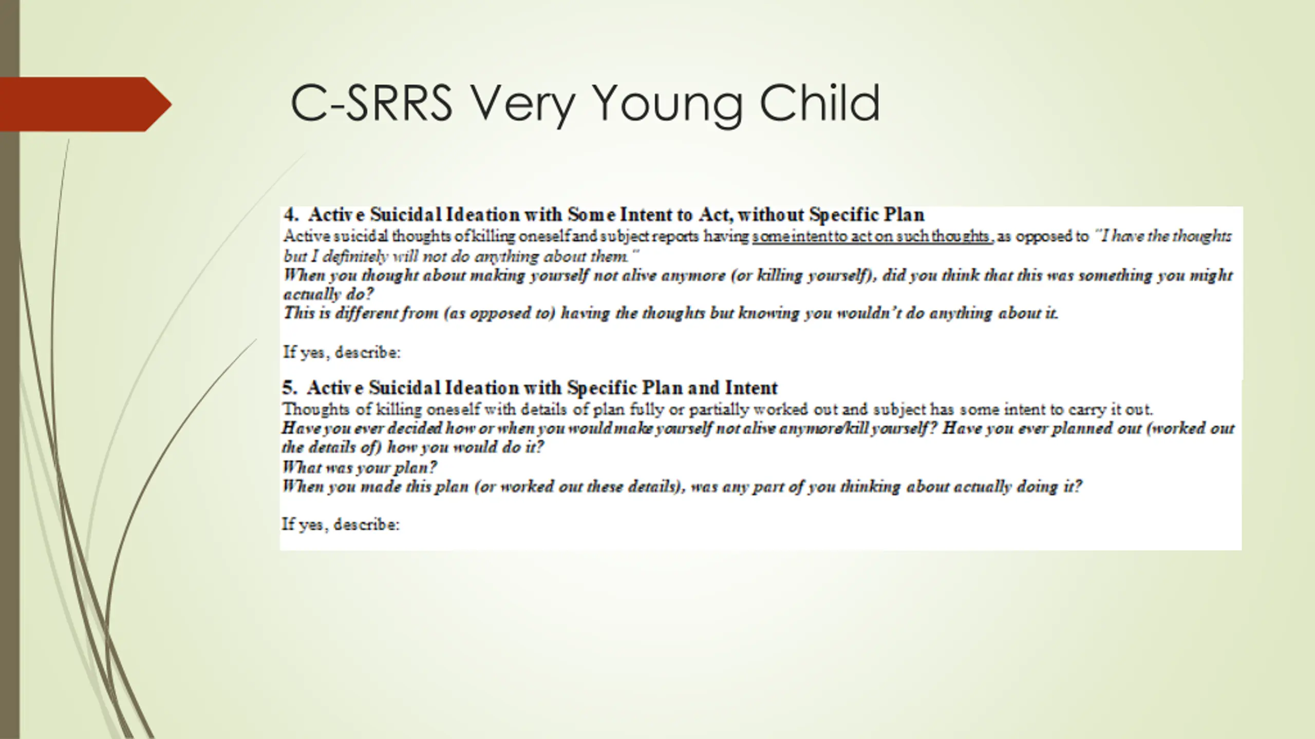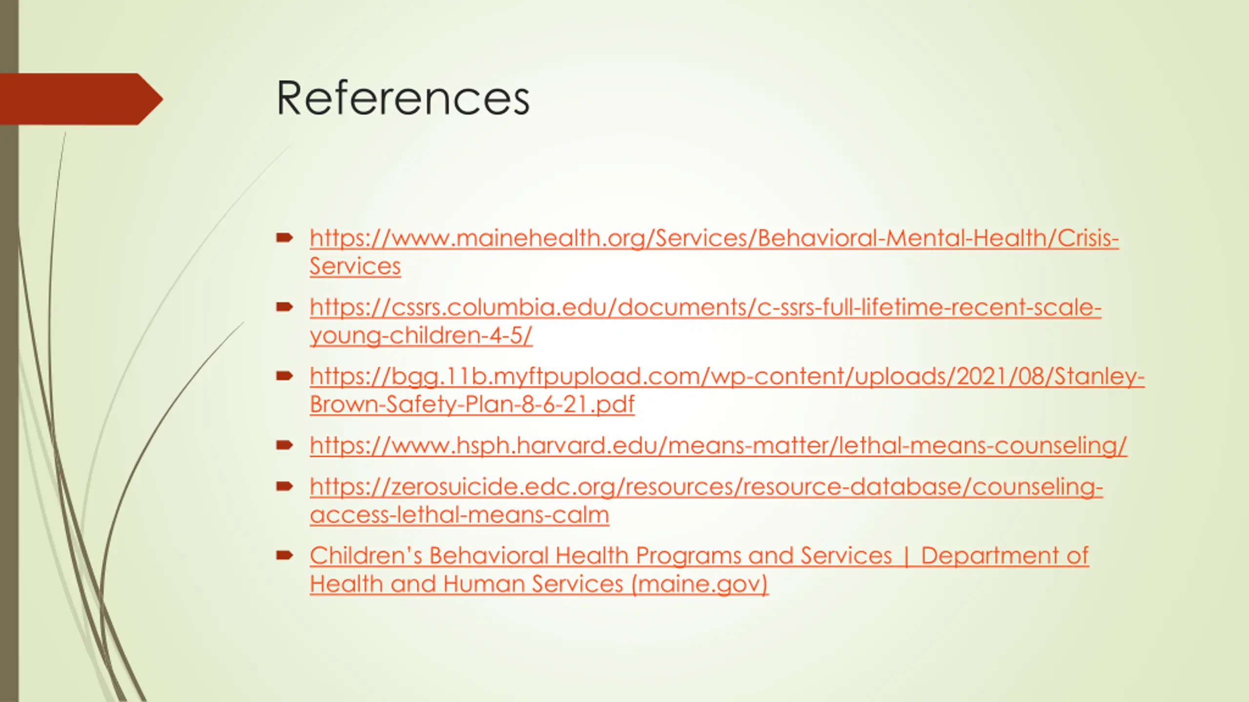 References https://www.mainehealth.org/Services/Behavioral-Mental-Health/Crisis- Services https://cssrs.columbia.edu/documents/c-ssrs-full-lifetime-recent-scale- young-children-4-5/ https://bgg.11b.myftpupload.com/wp-content/uploads/2021/08/Stanley- Brown-Safety-Plan-8-6-21.pdf https://www.hsph.harvard.edu/means-matter/lethal-means-counseling/ https://zerosuicide.edc.org/resources/resource-database/counseling- access-lethal-means-calm Children s Behavioral Health Programs and Services | Department of Health and Human Services (maine.gov)