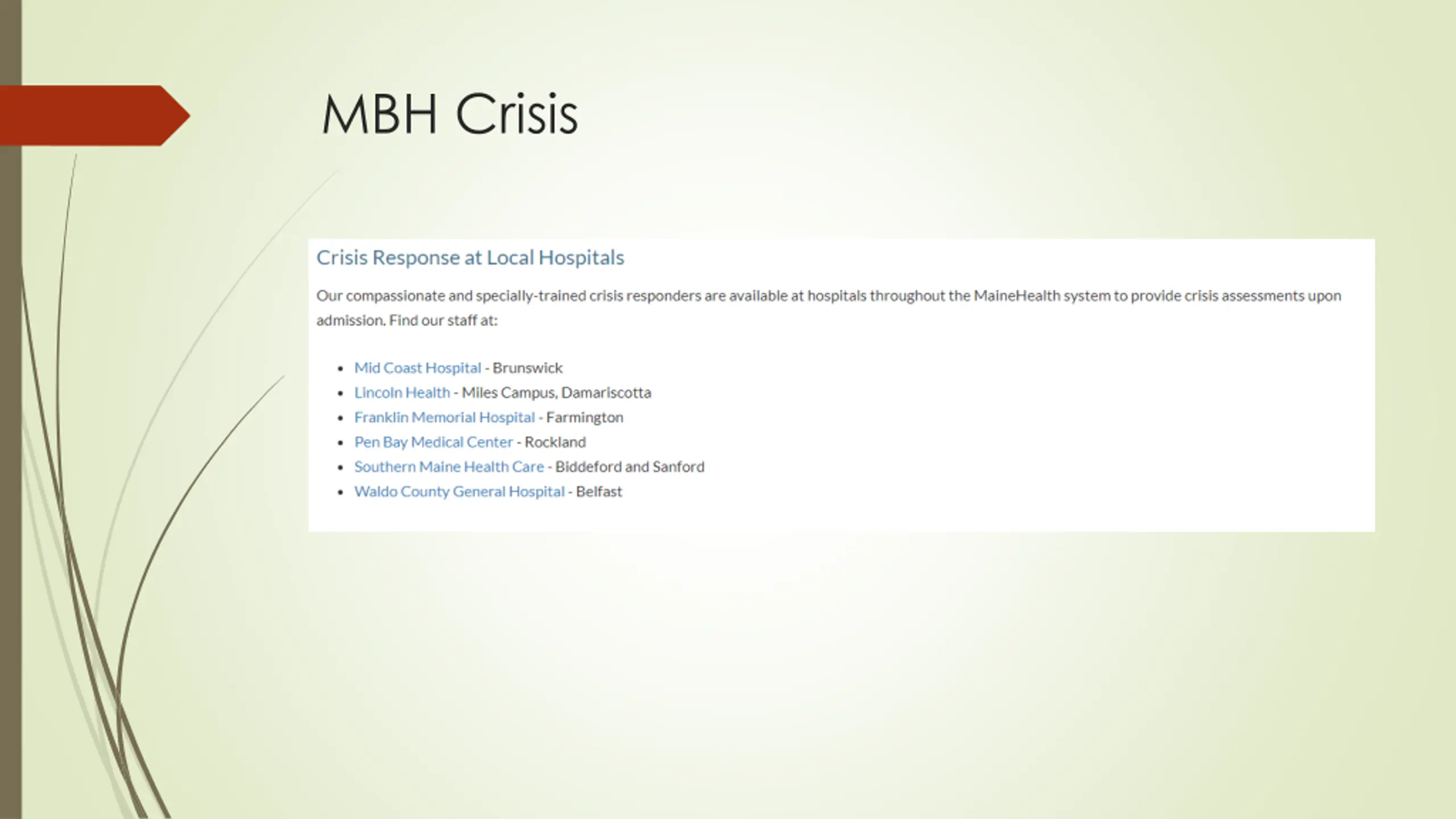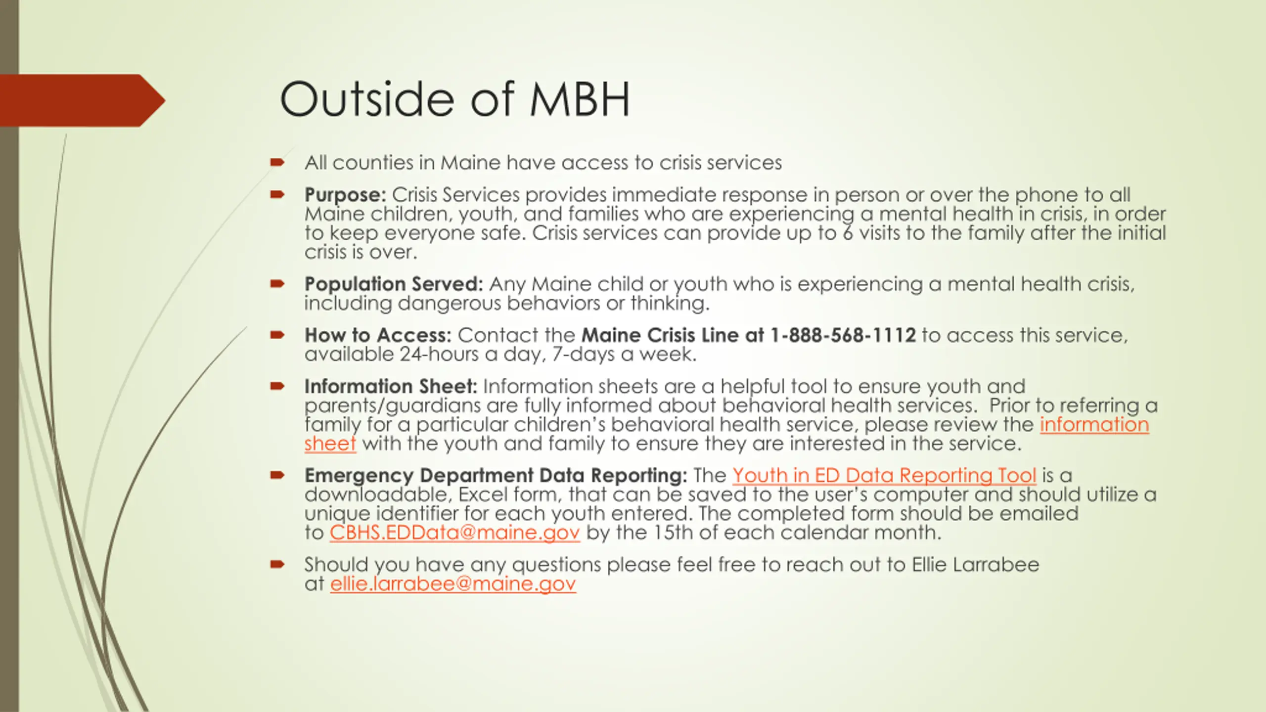 Outside of MBH All counties in Maine have access to crisis services Purpose: Crisis Services provides immediate response in person or over the phone to all Maine children, youth, and families who are experiencing a mental health in crisis, in order to keep everyone safe. Crisis services can provide up to 6 visits to the family after the initial crisis is over. Population Served: Any Maine child or youth who is experiencing a mental health crisis, including dangerous behaviors or thinking. How to Access: Contact the Maine Crisis Line at 1-888-568-1112 to access this service, available 24-hours a day, 7-days a week. Information Sheet: Information sheets are a helpful tool to ensure youth and parents/guardians are fully informed about behavioral health services. Prior to referring a family for a particular children s behavioral health service, please review the information sheet with the youth and family to ensure they are interested in the service. Emergency Department Data Reporting: The Youth in ED Data Reporting Tool is a downloadable, Excel form, that can be saved to the user s computer and should utilize a unique identifier for each youth entered. The completed form should be emailed to CBHS.EDData@maine.gov by the 15th of each calendar month. Should you have any questions please feel free to reach out to Ellie Larrabee at ellie.larrabee@maine.gov