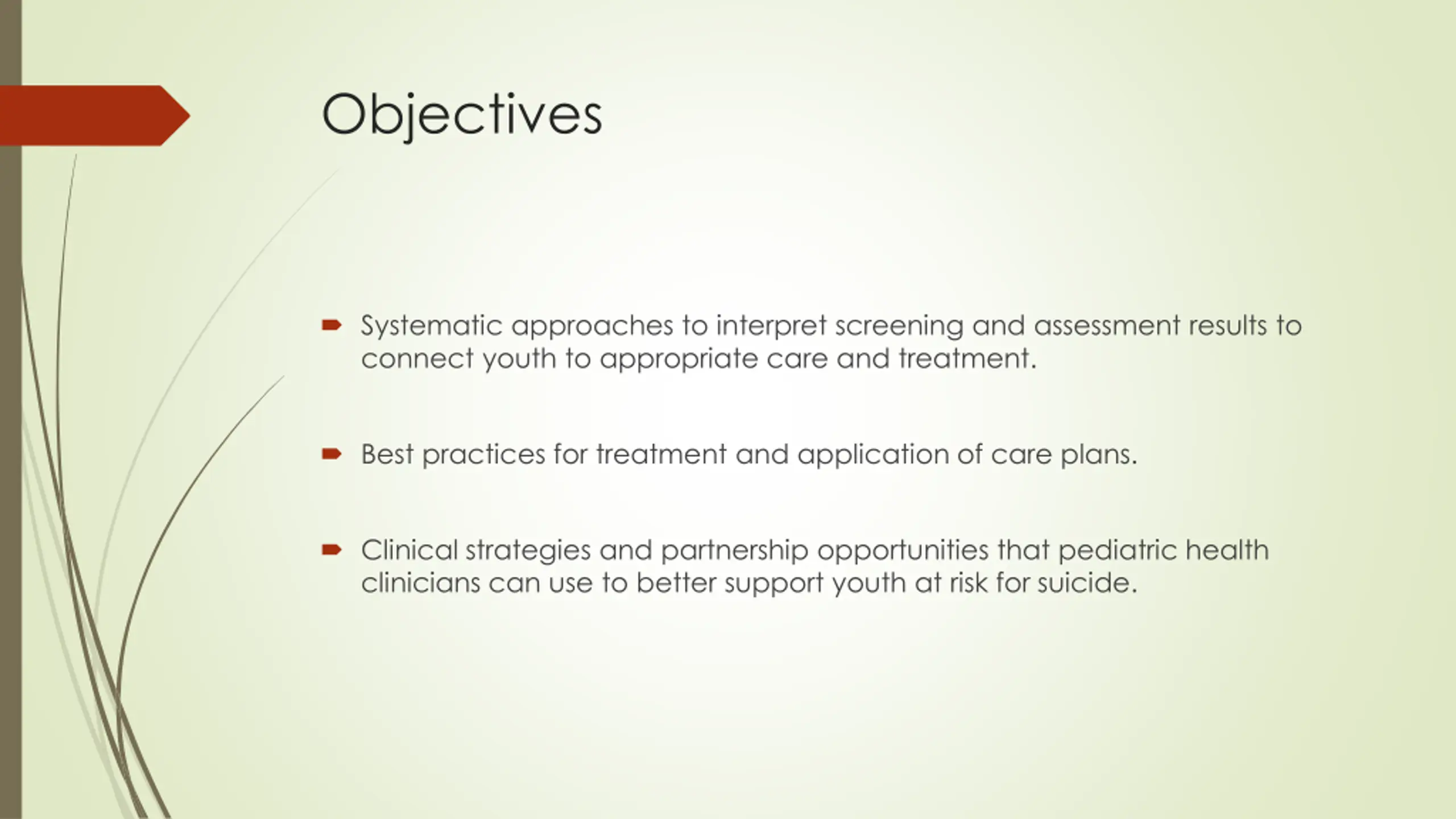 Objectives Systematic approaches to interpret screening and assessment results to connect youth to appropriate care and treatment. Best practices for treatment and application of care plans. Clinical strategies and partnership opportunities that pediatric health clinicians can use to better support youth at risk for suicide.