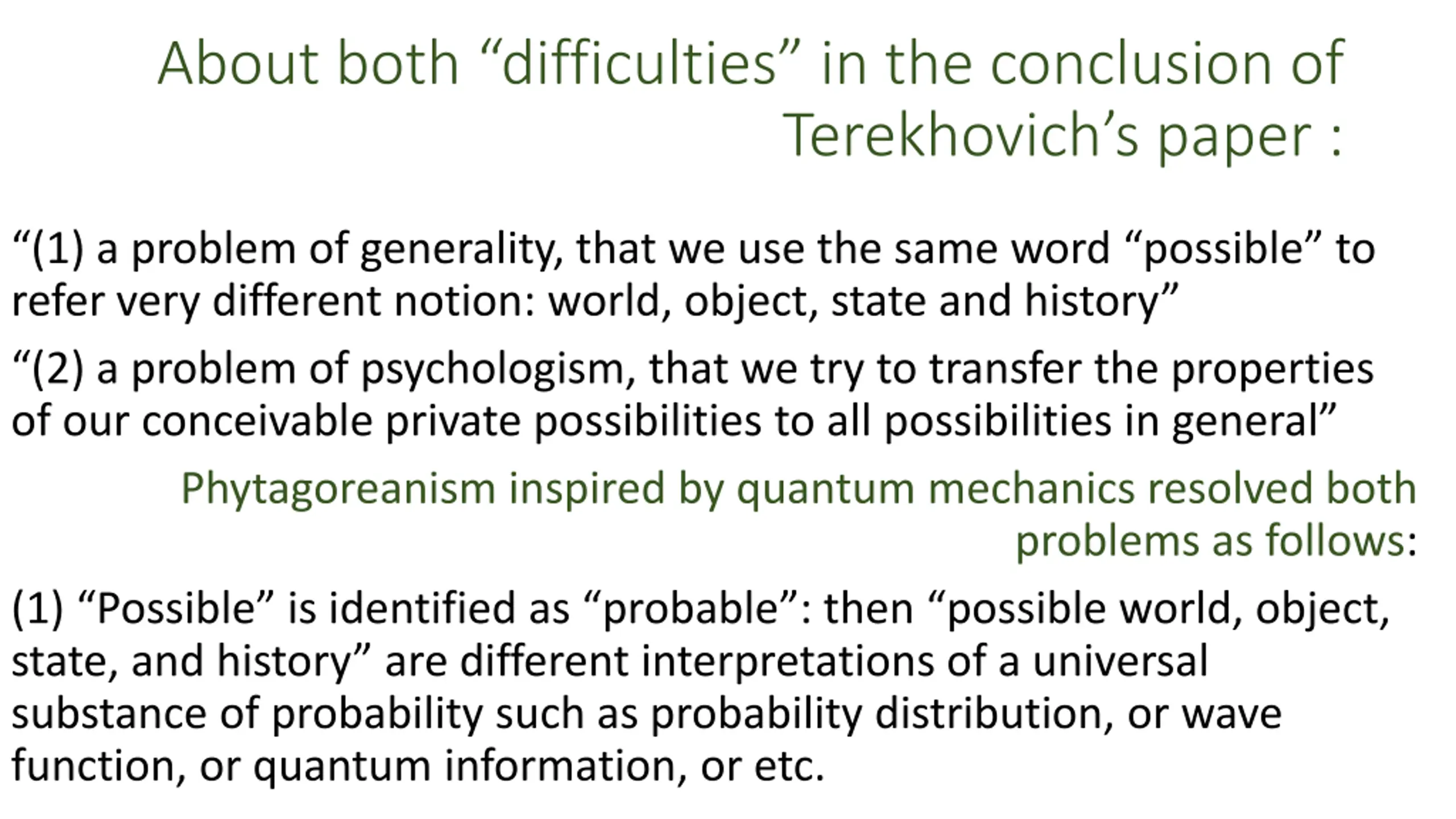 About both difficulties in the conclusion of Terekhovich s paper : (1) a problem of generality, that we use the same word possible to refer very different notion: world, object, state and history (2) a problem of psychologism, that we try to transfer the properties of our conceivable private possibilities to all possibilities in general Phytagoreanism inspired by quantum mechanics resolved both problems as follows: (1) Possible is identified as probable : then possible world, object, state, and history are different interpretations of a universal substance of probability such as probability distribution, or wave function, or quantum information, or etc.