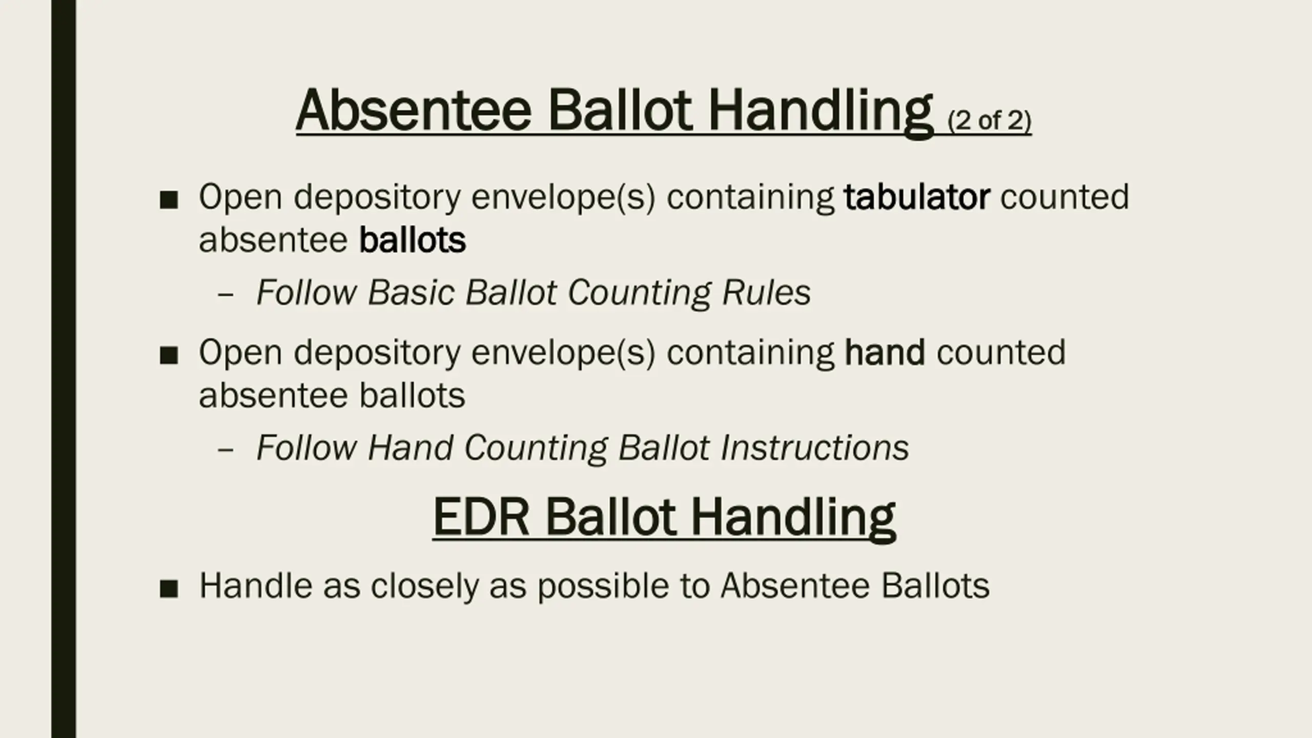Absentee Ballot Handling Absentee Ballot Handling (2 of 2) (2 of 2) Open depository envelope(s) containing tabulator absentee ballots ballots Follow Basic Ballot Counting Rules Open depository envelope(s) containing hand absentee ballots Follow Hand Counting Ballot Instructions EDR Ballot Handling EDR Ballot Handling Handle as closely as possible to Absentee Ballots tabulator counted hand counted