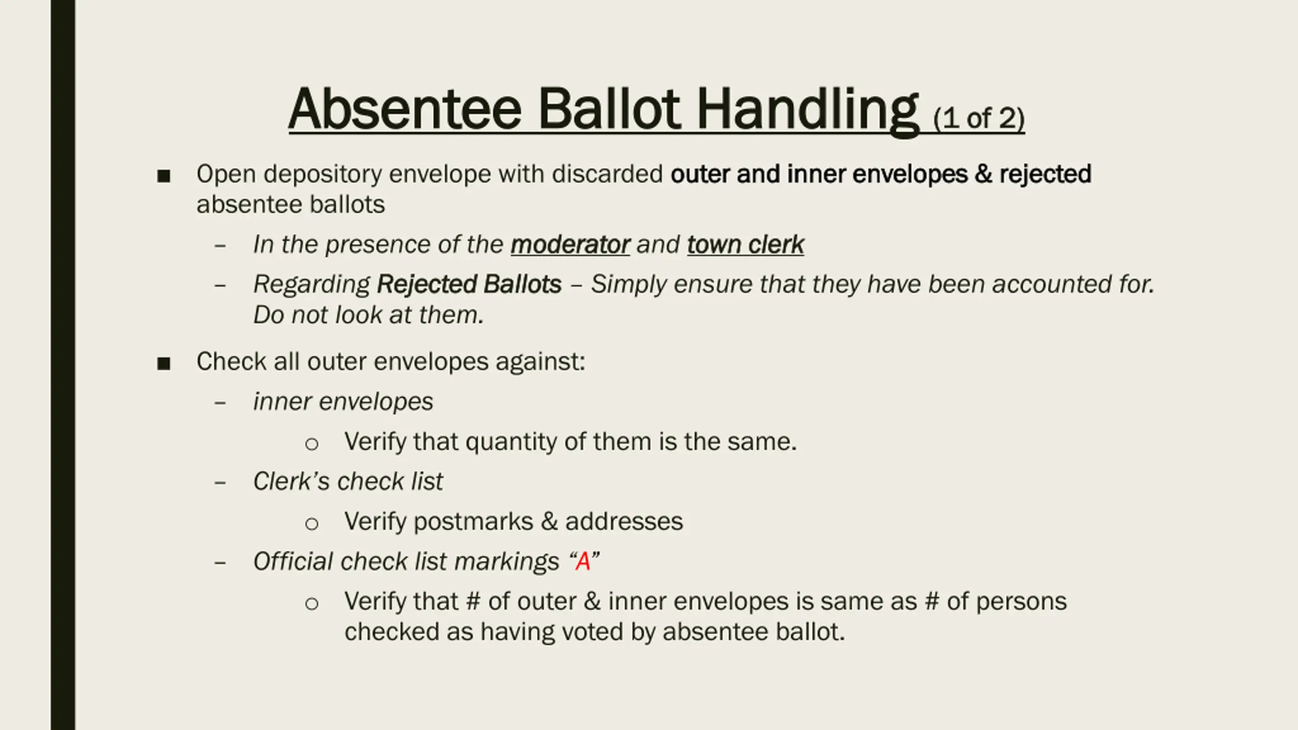 Absentee Ballot Handling Absentee Ballot Handling (1 of 2) (1 of 2) Open depository envelope with discarded outer and inner envelopes & rejected absentee ballots In the presence of the moderator moderator and town clerk Regarding Rejected Ballots Rejected Ballots Simply ensure that they have been accounted for. Do not look at them. outer and inner envelopes & rejected town clerk Check all outer envelopes against: inner envelopes o Verify that quantity of them is the same. Clerk s check list o Verify postmarks & addresses Official check list markings A o Verify that # of outer & inner envelopes is same as # of persons checked as having voted by absentee ballot.