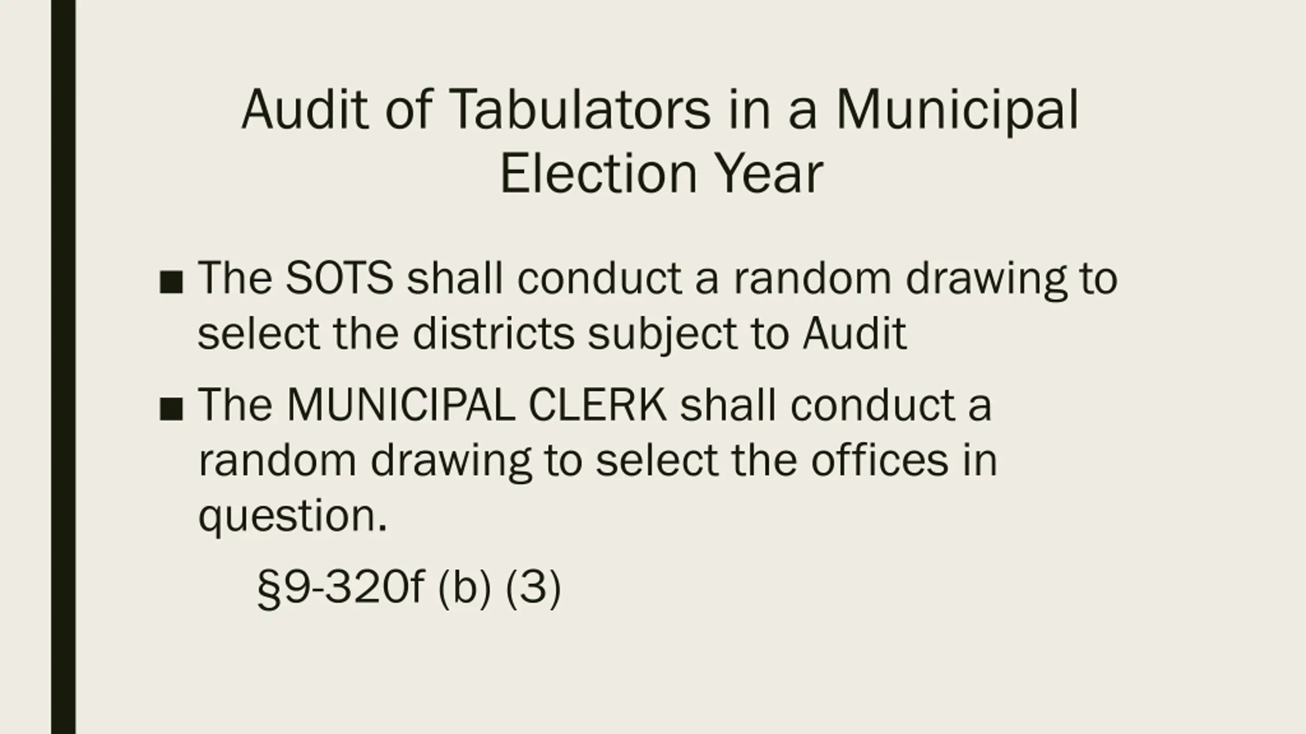 Audit of Tabulators in a Municipal Election Year The SOTS shall conduct a random drawing to select the districts subject to Audit The MUNICIPAL CLERK shall conduct a random drawing to select the offices in question. 9-320f (b) (3)