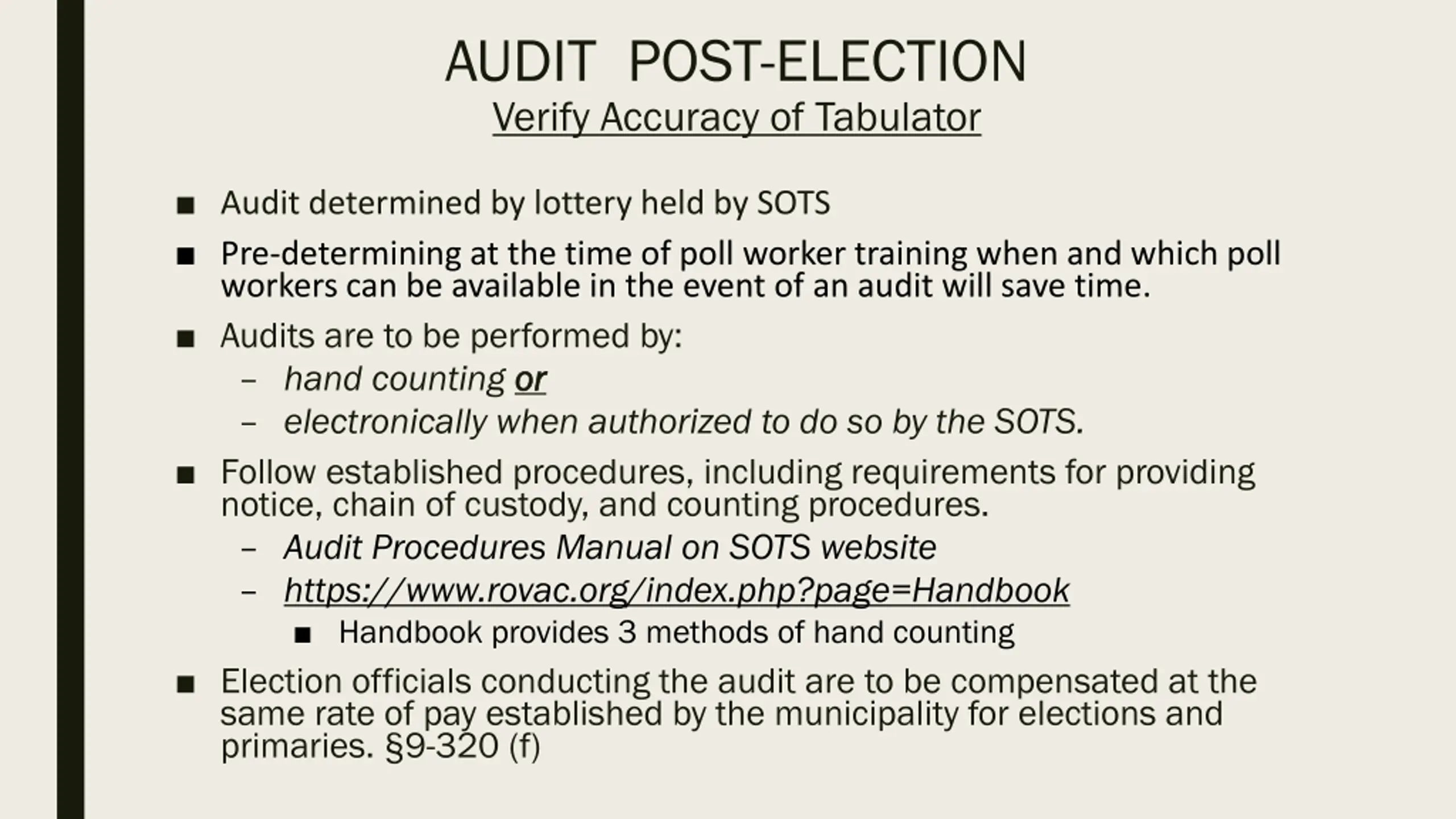 AUDIT POST-ELECTION Verify Accuracy of Tabulator Audit determined by lottery held by SOTS Pre-determining at the time of poll worker training when and which poll workers can be available in the event of an audit will save time. Audits are to be performed by: hand counting or or electronically when authorized to do so by the SOTS. Follow established procedures, including requirements for providing notice, chain of custody, and counting procedures. Audit Procedures Manual on SOTS website https://www.rovac.org/index.php?page=Handbook Handbook provides 3 methods of hand counting Election officials conducting the audit are to be compensated at the same rate of pay established by the municipality for elections and primaries. 9-320 (f)
