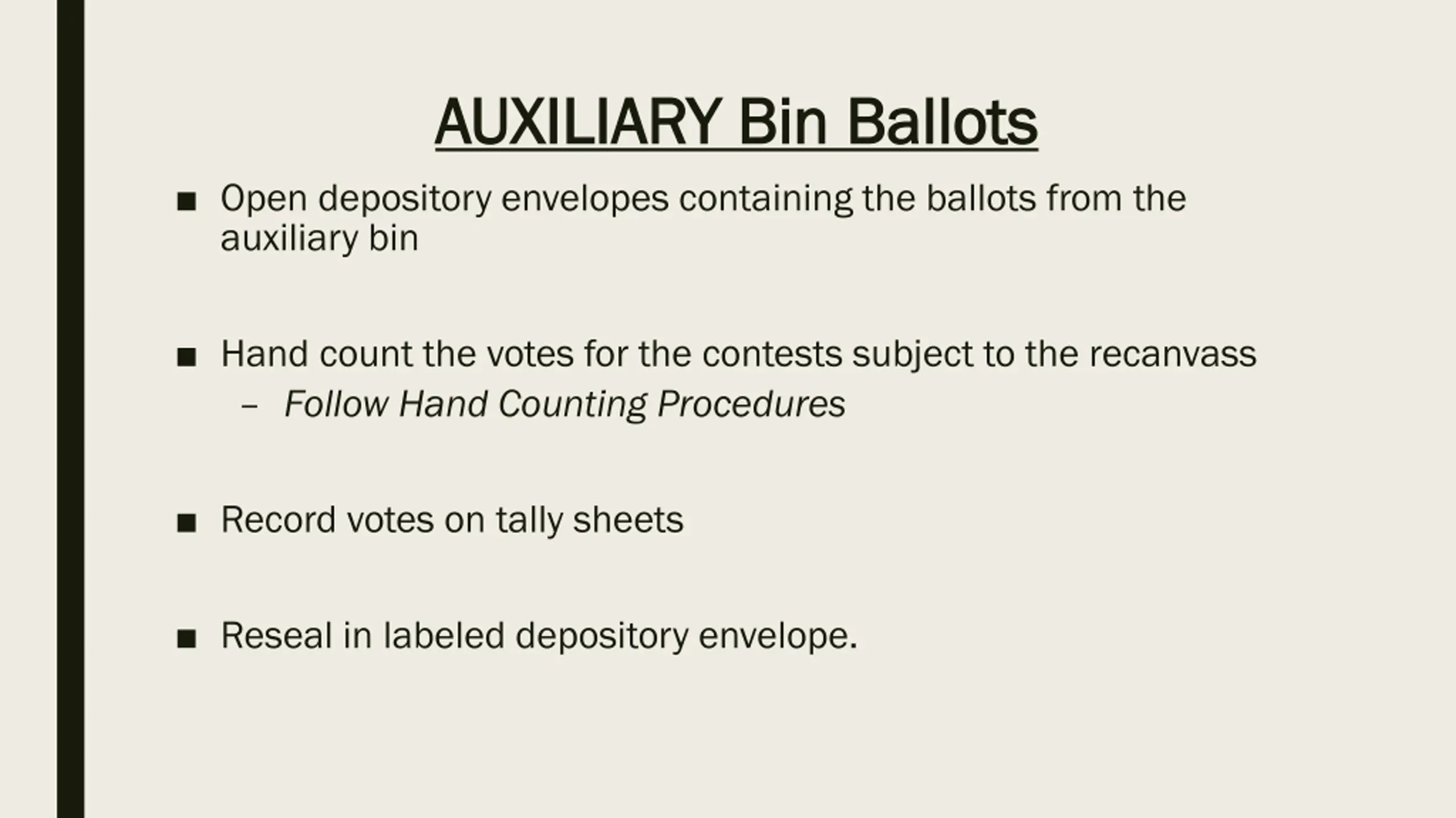 AUXILIARY Bin Ballots AUXILIARY Bin Ballots Open depository envelopes containing the ballots from the auxiliary bin Hand count the votes for the contests subject to the recanvass Follow Hand Counting Procedures Record votes on tally sheets Reseal in labeled depository envelope.