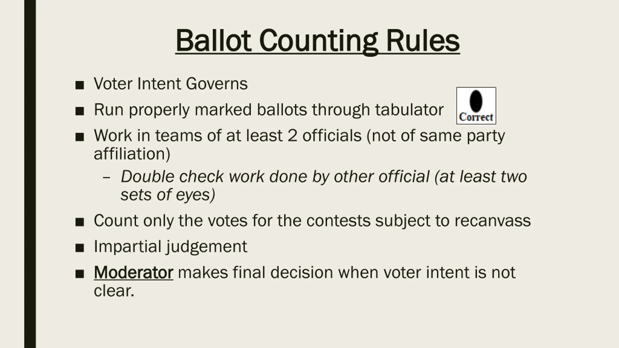 Ballot Counting Rules Ballot Counting Rules Voter Intent Governs Run properly marked ballots through tabulator Work in teams of at least 2 officials (not of same party affiliation) Double check work done by other official (at least two sets of eyes) Count only the votes for the contests subject to recanvass Impartial judgement Moderator Moderator makes final decision when voter intent is not clear.