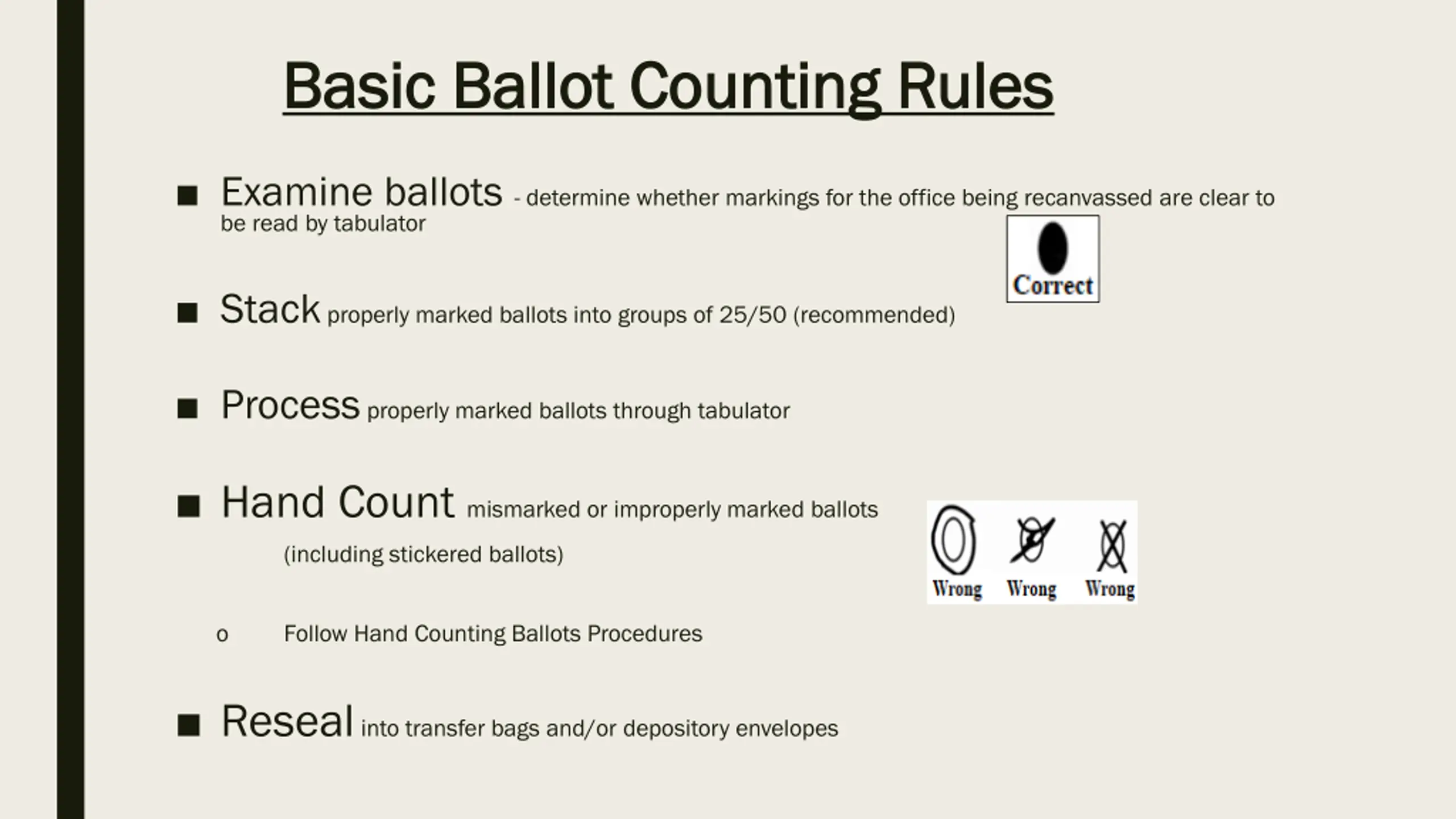 Basic Ballot Counting Rules Basic Ballot Counting Rules Examine ballots - determine whether markings for the office being recanvassed are clear to be read by tabulator Stack properly marked ballots into groups of 25/50 (recommended) Process properly marked ballots through tabulator Hand Count mismarked or improperly marked ballots (including stickered ballots) o Follow Hand Counting Ballots Procedures Reseal into transfer bags and/or depository envelopes