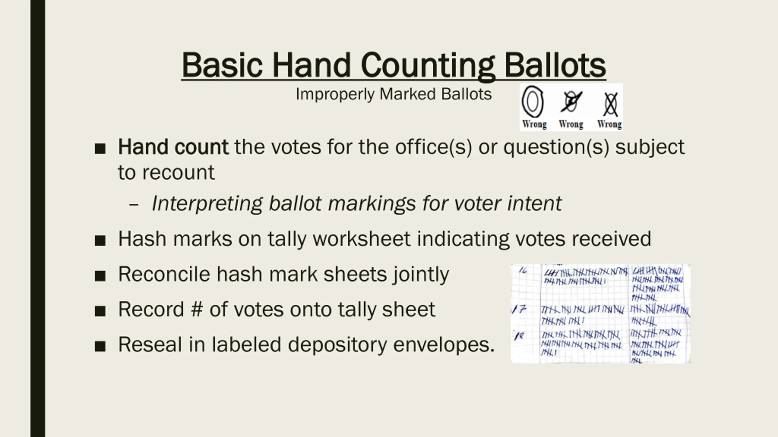 Basic Hand Counting Ballots Basic Hand Counting Ballots Improperly Marked Ballots Hand count Hand count the votes for the office(s) or question(s) subject to recount Interpreting ballot markings for voter intent Hash marks on tally worksheet indicating votes received Reconcile hash mark sheets jointly Record # of votes onto tally sheet Reseal in labeled depository envelopes.