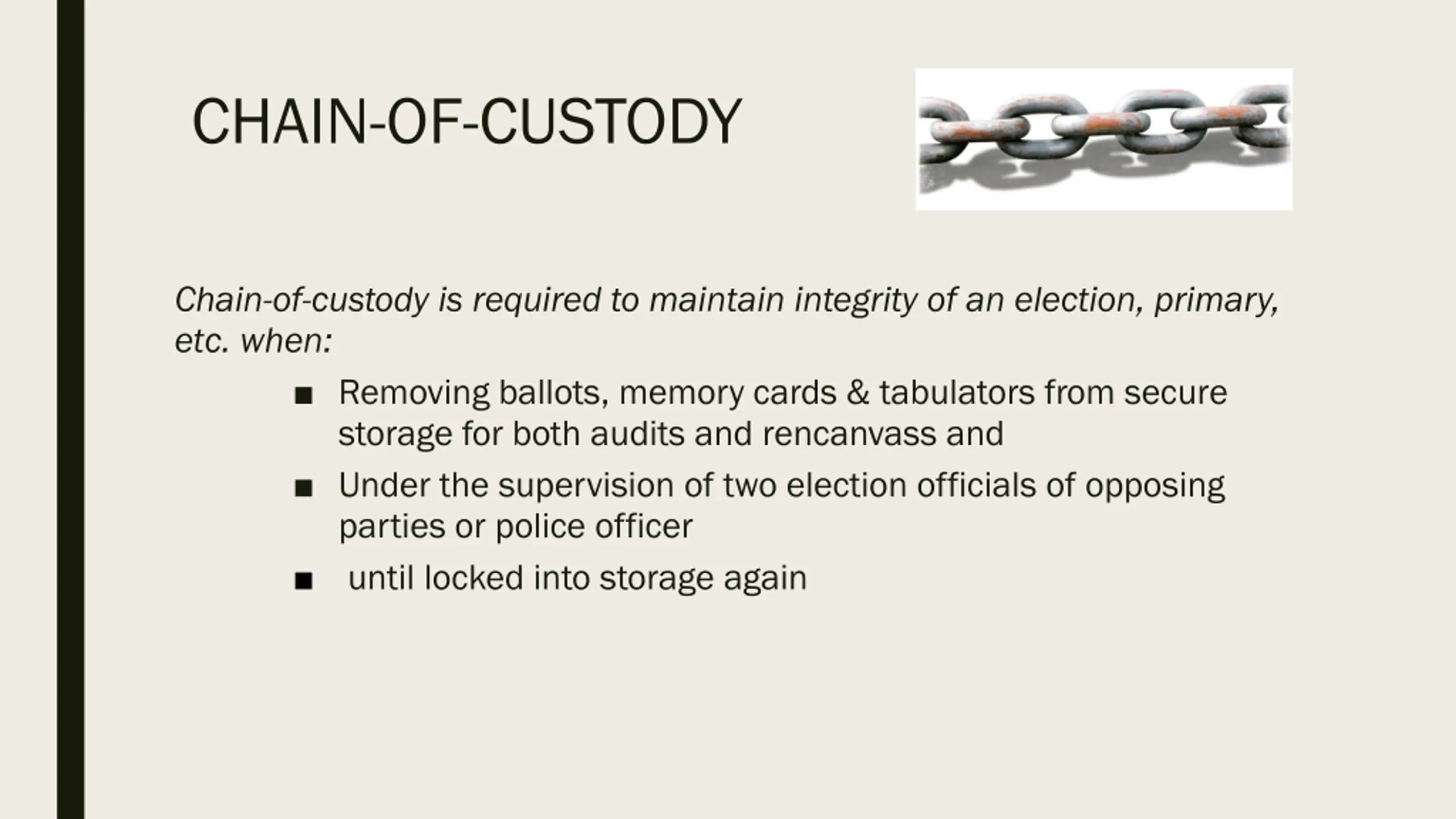 CHAIN-OF-CUSTODY Chain-of-custody is required to maintain integrity of an election, primary, etc. when: Removing ballots, memory cards & tabulators from secure storage for both audits and rencanvass and Under the supervision of two election officials of opposing parties or police officer until locked into storage again