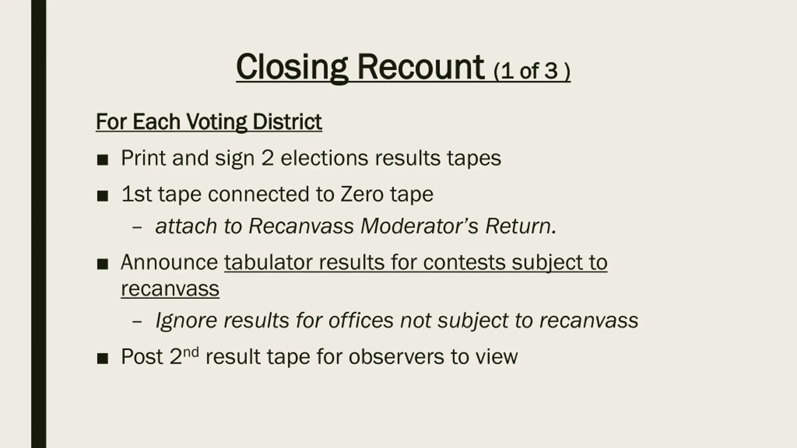 Closing Recount Closing Recount (1 of 3 ) (1 of 3 ) For Each Voting District For Each Voting District Print and sign 2 elections results tapes 1st tape connected to Zero tape attach to Recanvass Moderator s Return. Announce tabulator results for contests subject to recanvass Ignore results for offices not subject to recanvass Post 2nd result tape for observers to view