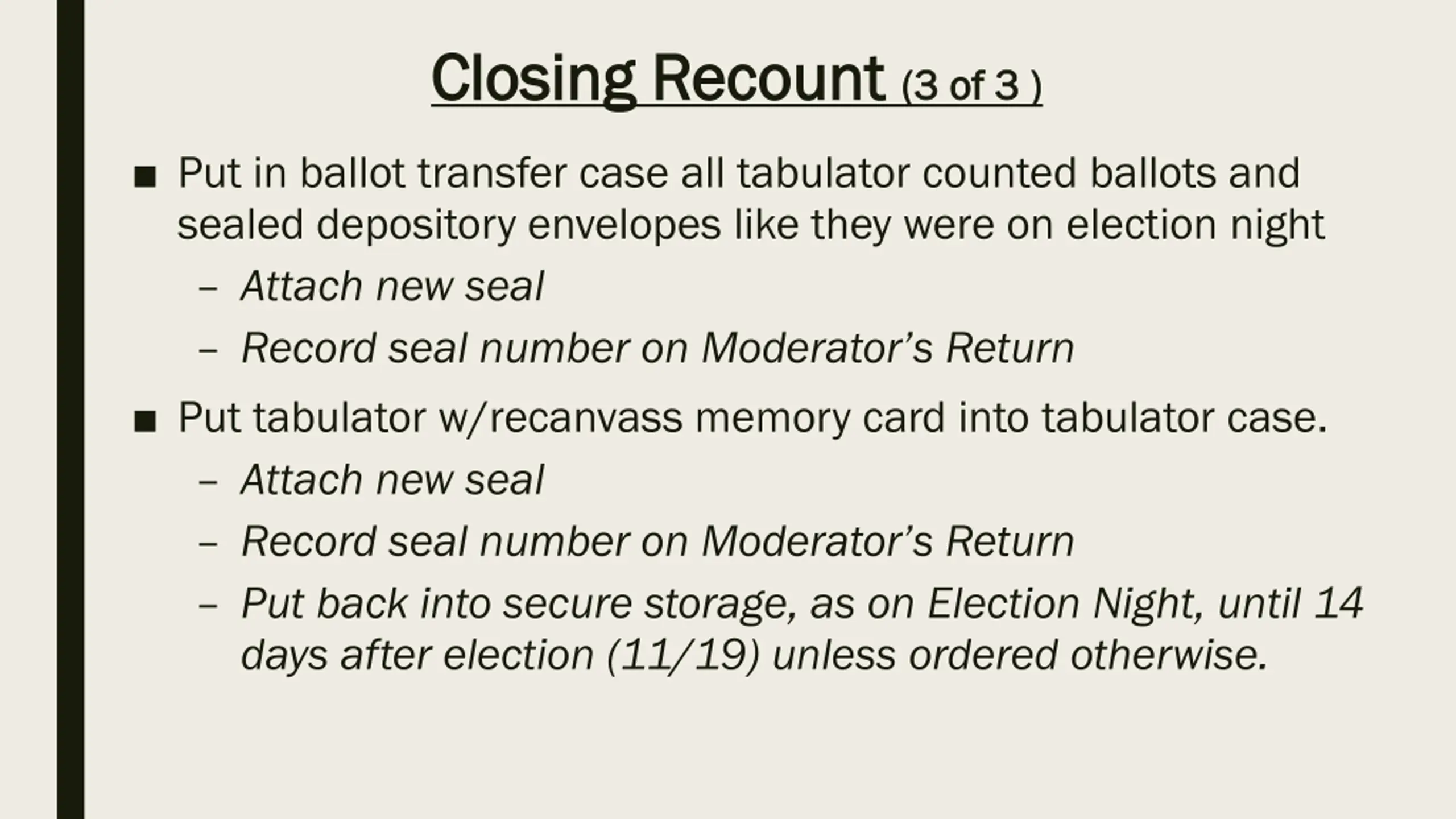 Closing Recount Closing Recount (2 of 3 ) After all votes subject to recanvass are counted: Record results on proper tally sheets Complete Certificate of Closing Polls form with moderator & at least two officials signatures. Record seal numbers from tabulator(s) and ballot transfer cases Complete Moderator s Returns for office(s) subject to recanvass (this form is not in recanvass manual) Announce results for contests subject to recanvass (2 of 3 )