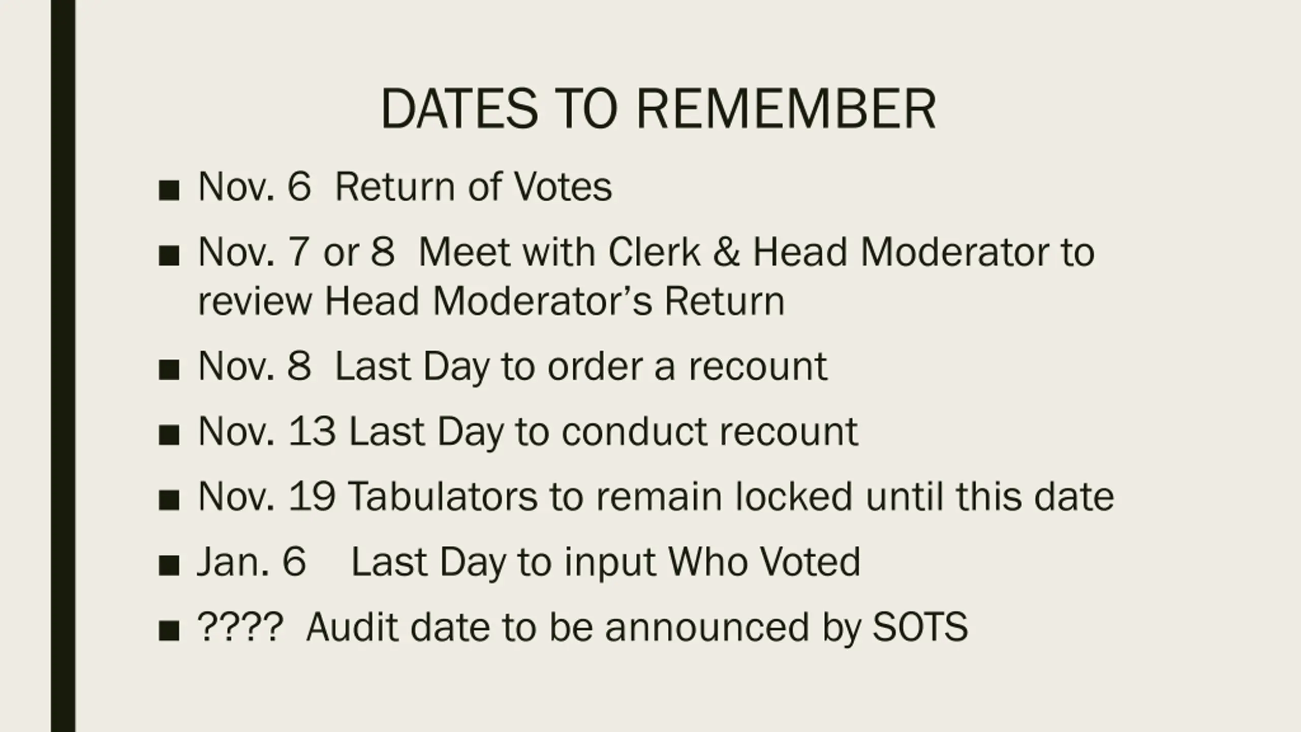 DATES TO REMEMBER Nov. 6 Return of Votes Nov. 7 or 8 Meet with Clerk & Head Moderator to review Head Moderator s Return Nov. 8 Last Day to order a recount Nov. 13 Last Day to conduct recount Nov. 19 Tabulators to remain locked until this date Jan. 6 Last Day to input Who Voted ???? Audit date to be announced by SOTS