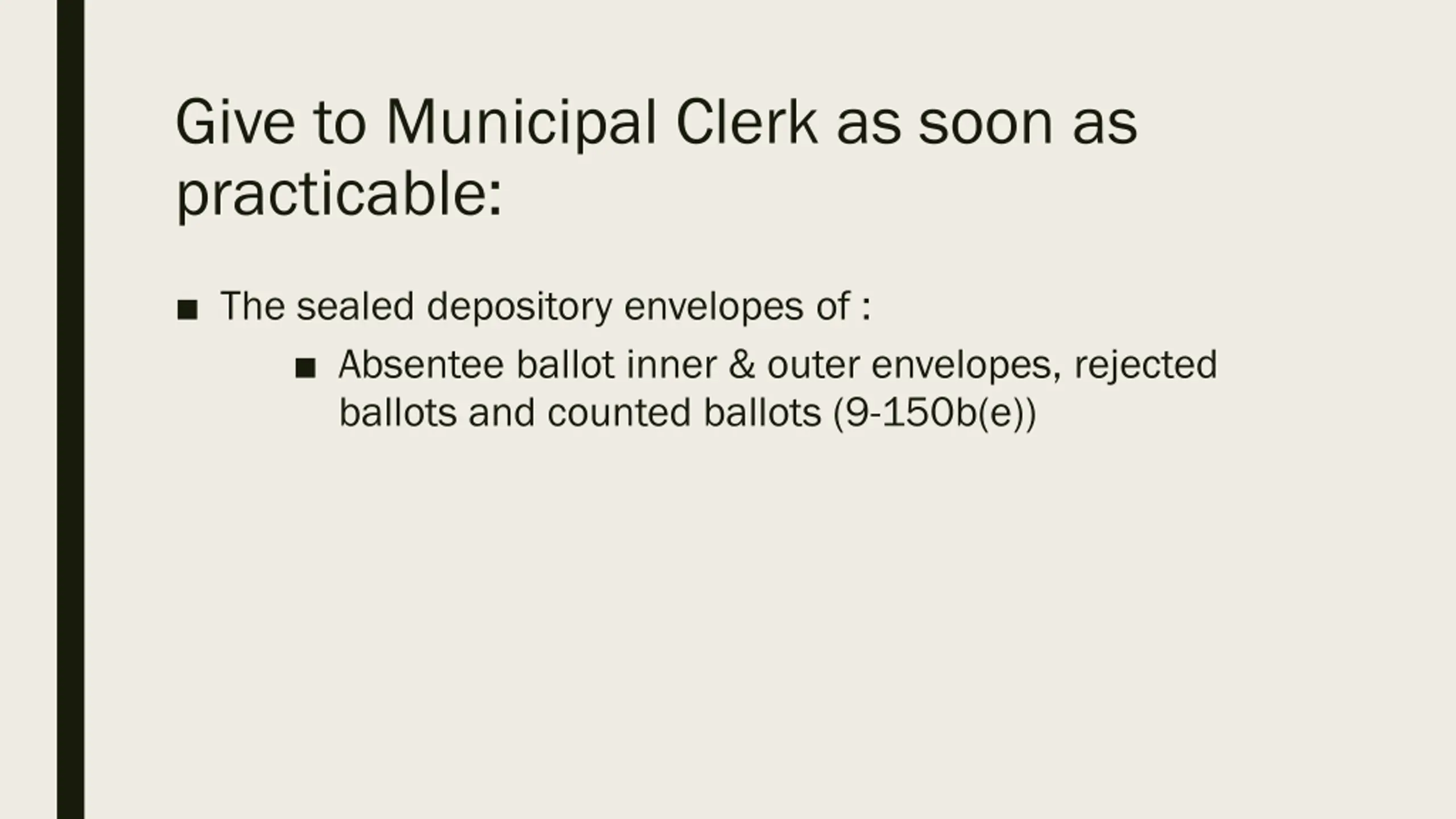 Give to Municipal Clerk as soon as practicable: The sealed depository envelopes of : Absentee ballot inner & outer envelopes, rejected ballots and counted ballots (9-150b(e))