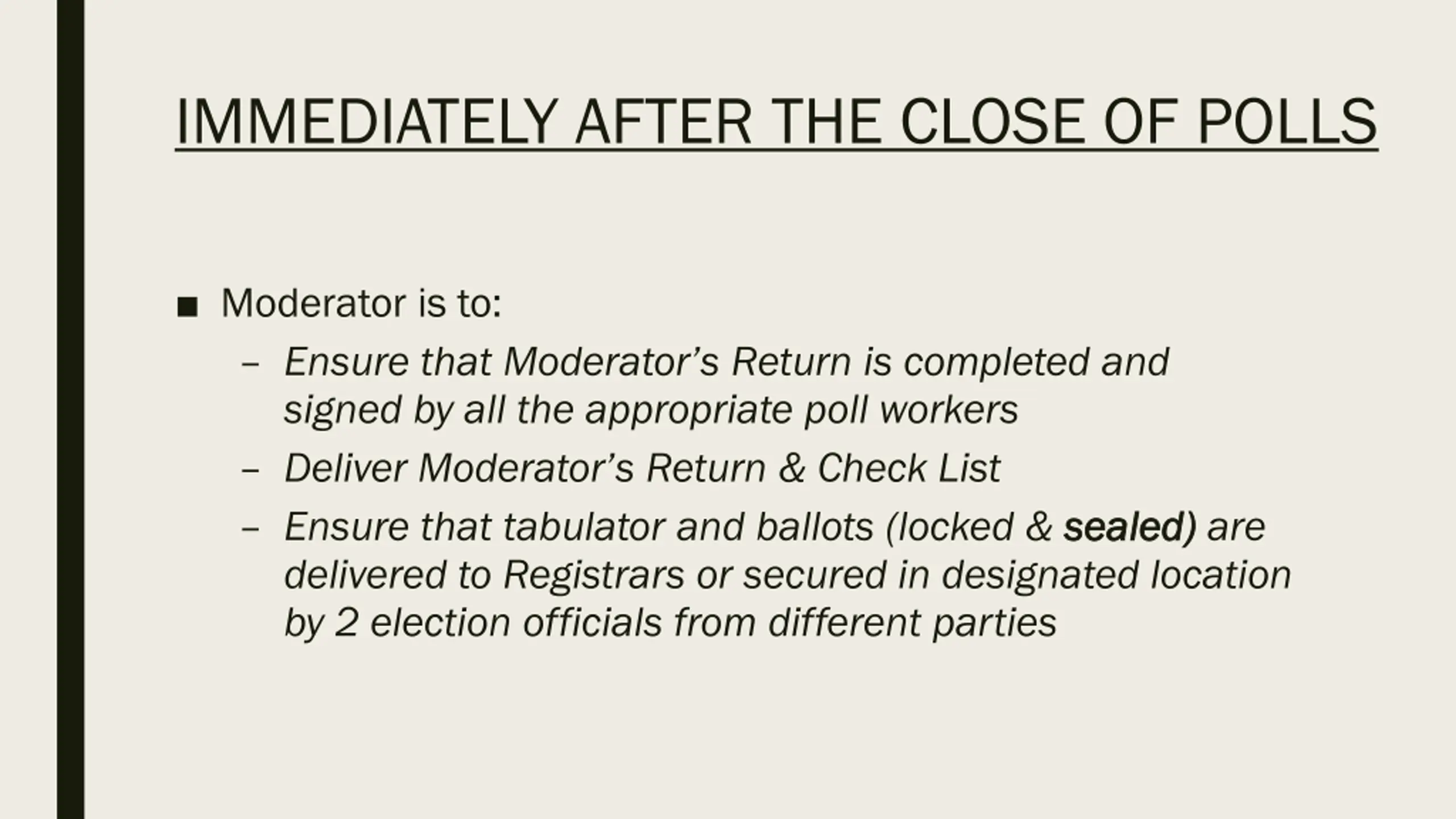 IMMEDIATELY AFTER THE CLOSE OF POLLS Moderator is to: Ensure that Moderator s Return is completed and signed by all the appropriate poll workers Deliver Moderator s Return & Check List Ensure that tabulator and ballots (locked & sealed) delivered to Registrars or secured in designated location by 2 election officials from different parties sealed) are