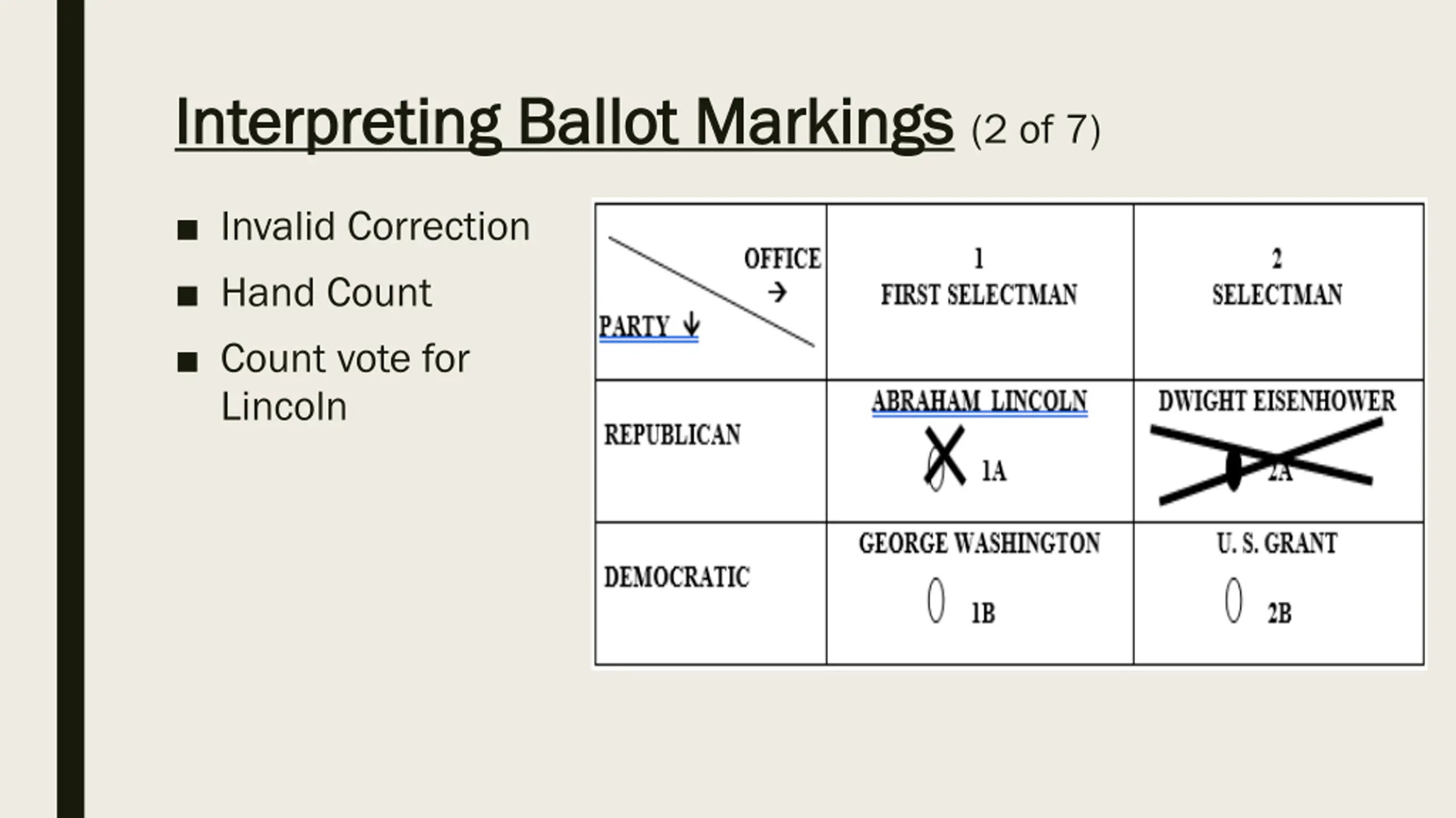 Interpreting Ballot Markings Interpreting Ballot Markings (2 of 7) Invalid Correction Hand Count Count vote for Lincoln