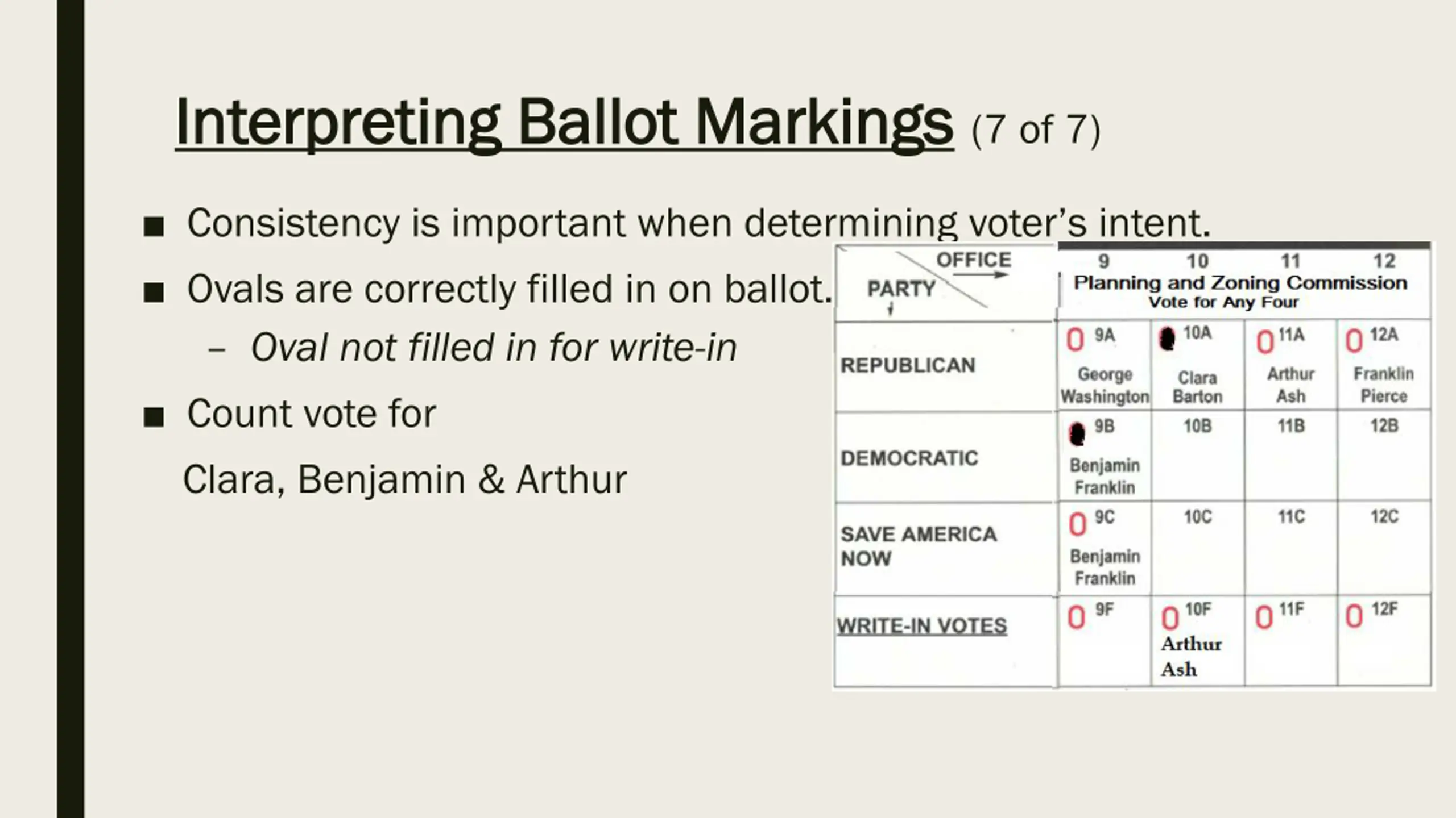 Interpreting Ballot Markings Interpreting Ballot Markings (6 of 7) Intent of Voter Must be Clear (Ben Franklin or Franklin Pierce), the write-in vote would not be counted Clara Barton is the only clear vote